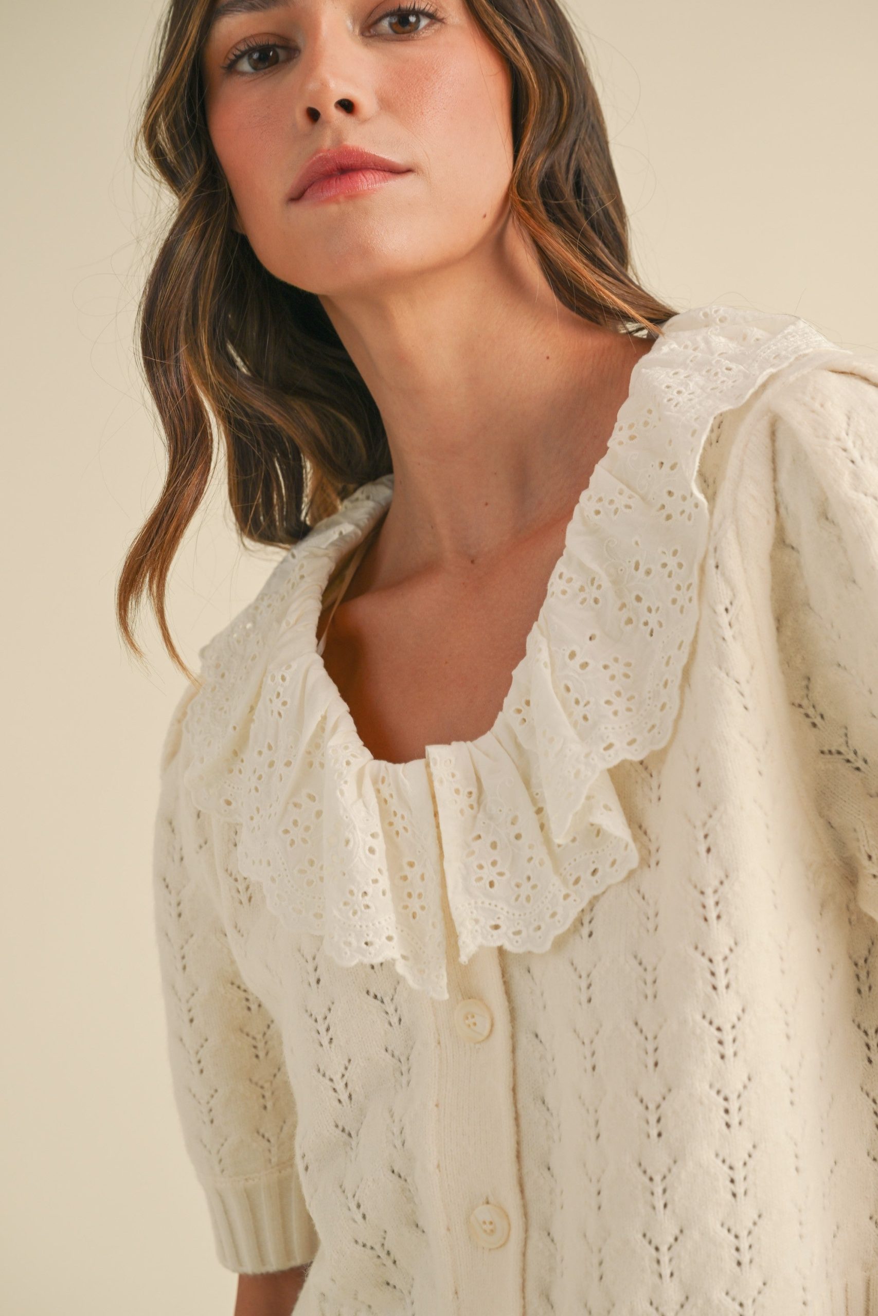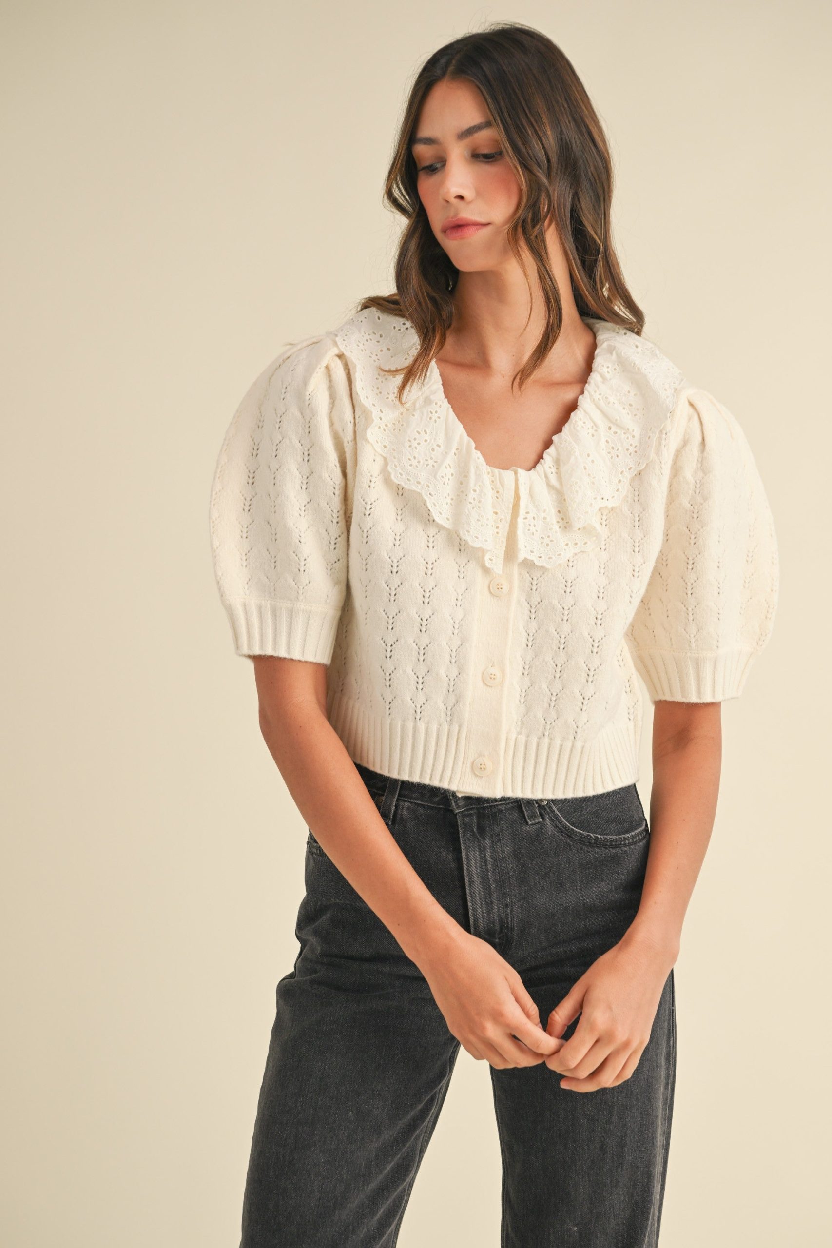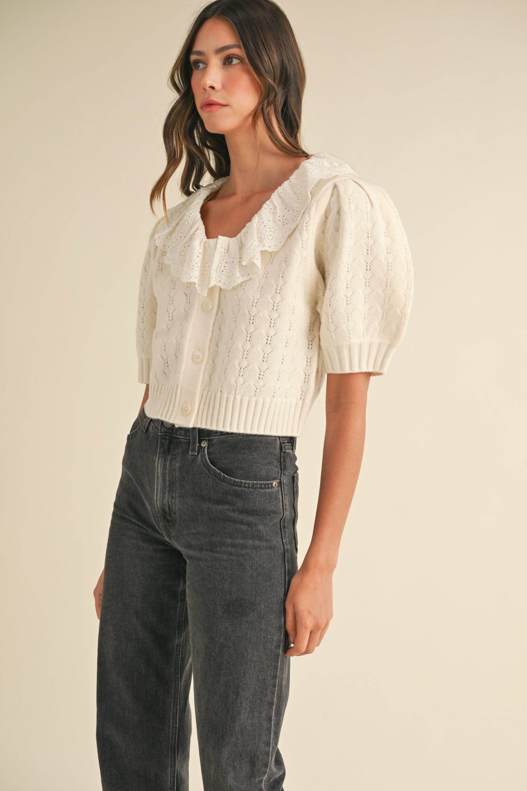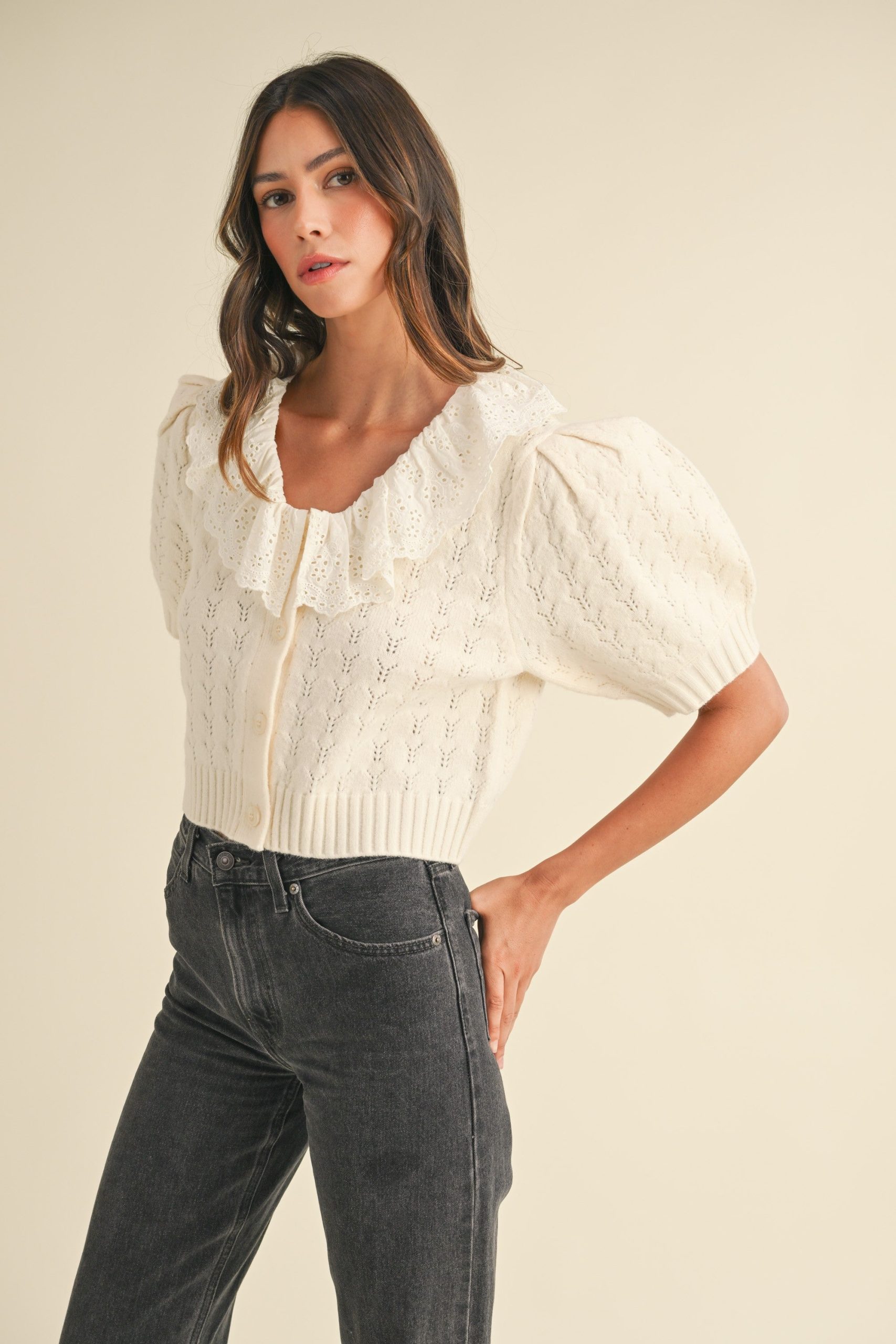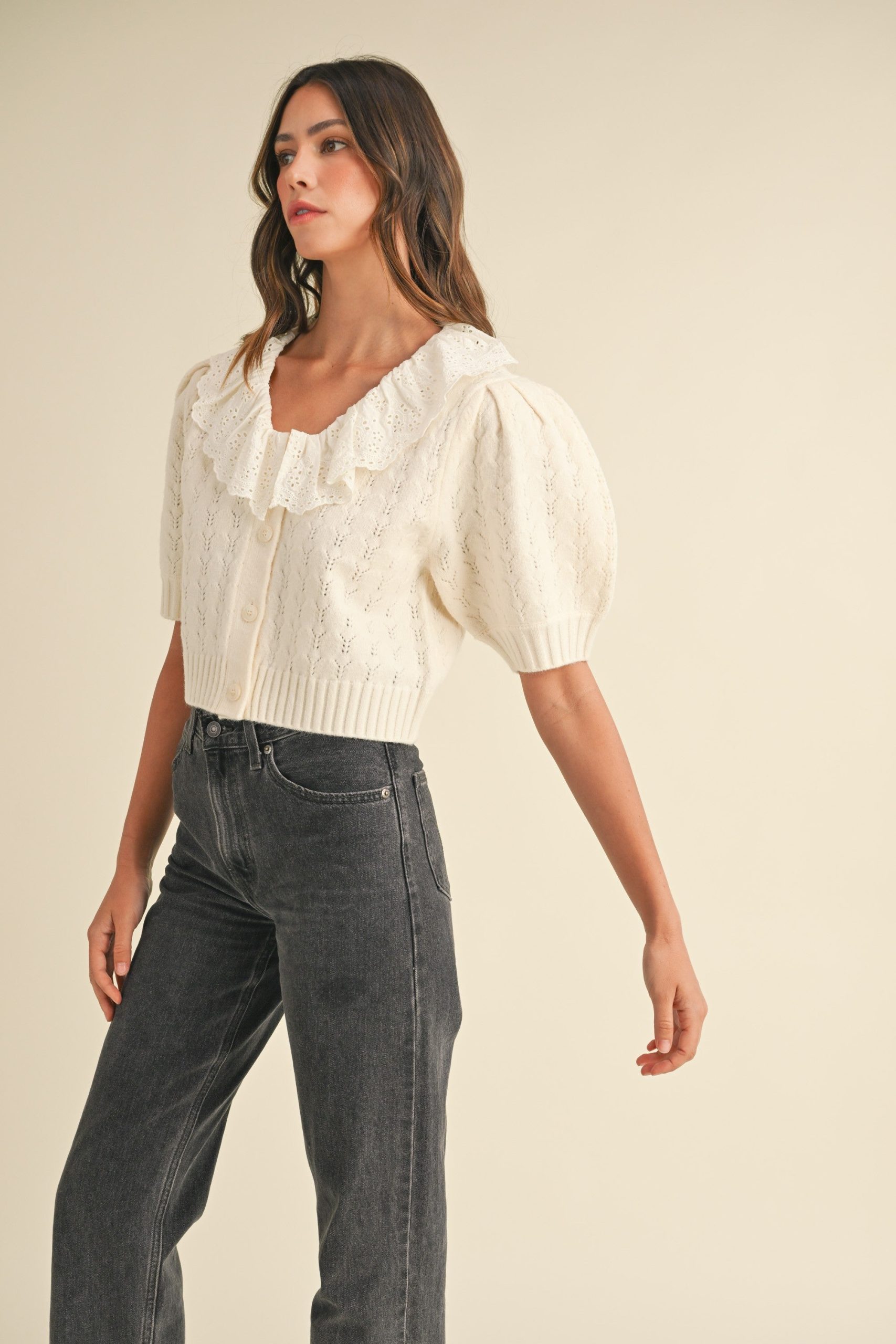 Openwork-knit Ruffled-lace Collar Cropped Cardigan