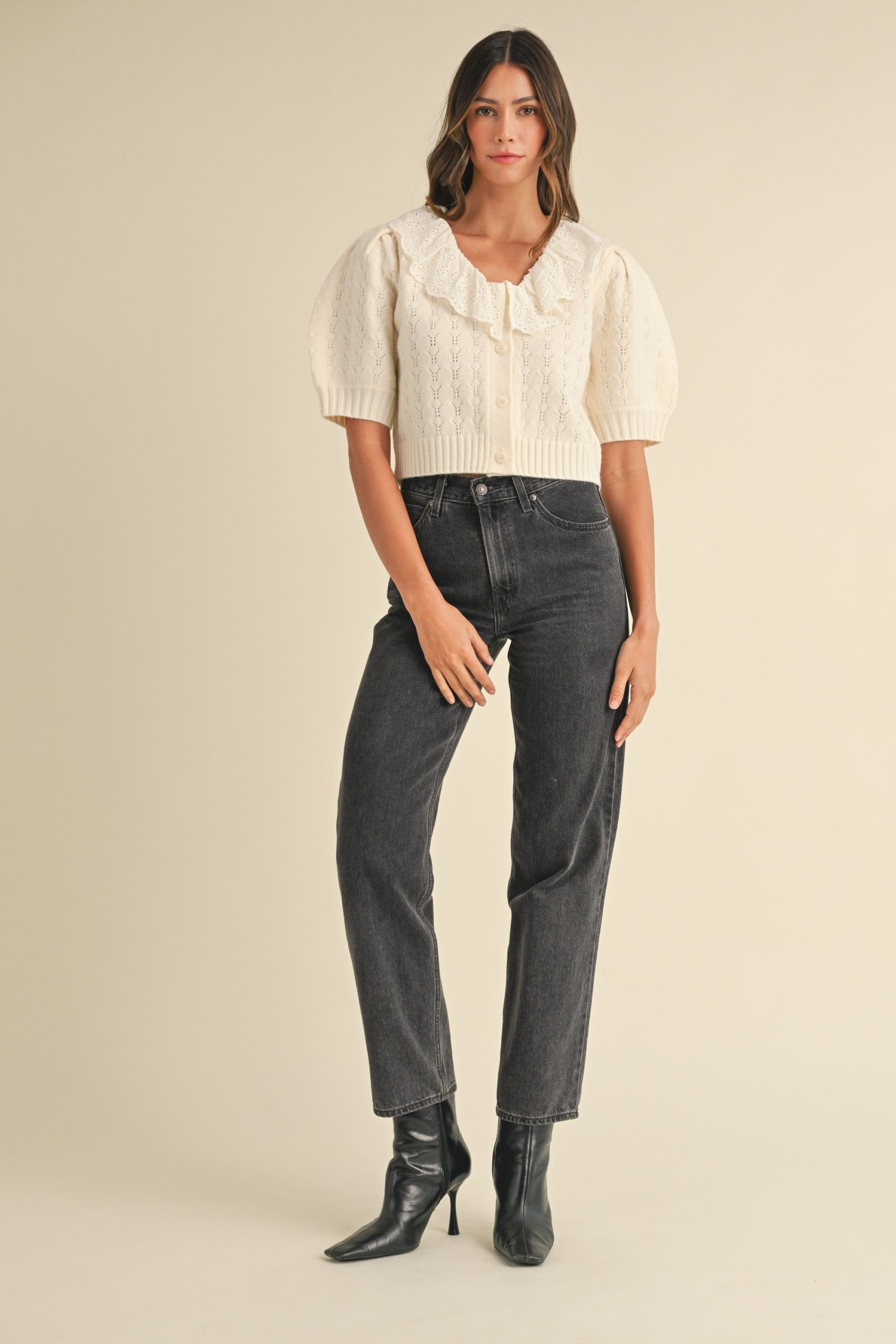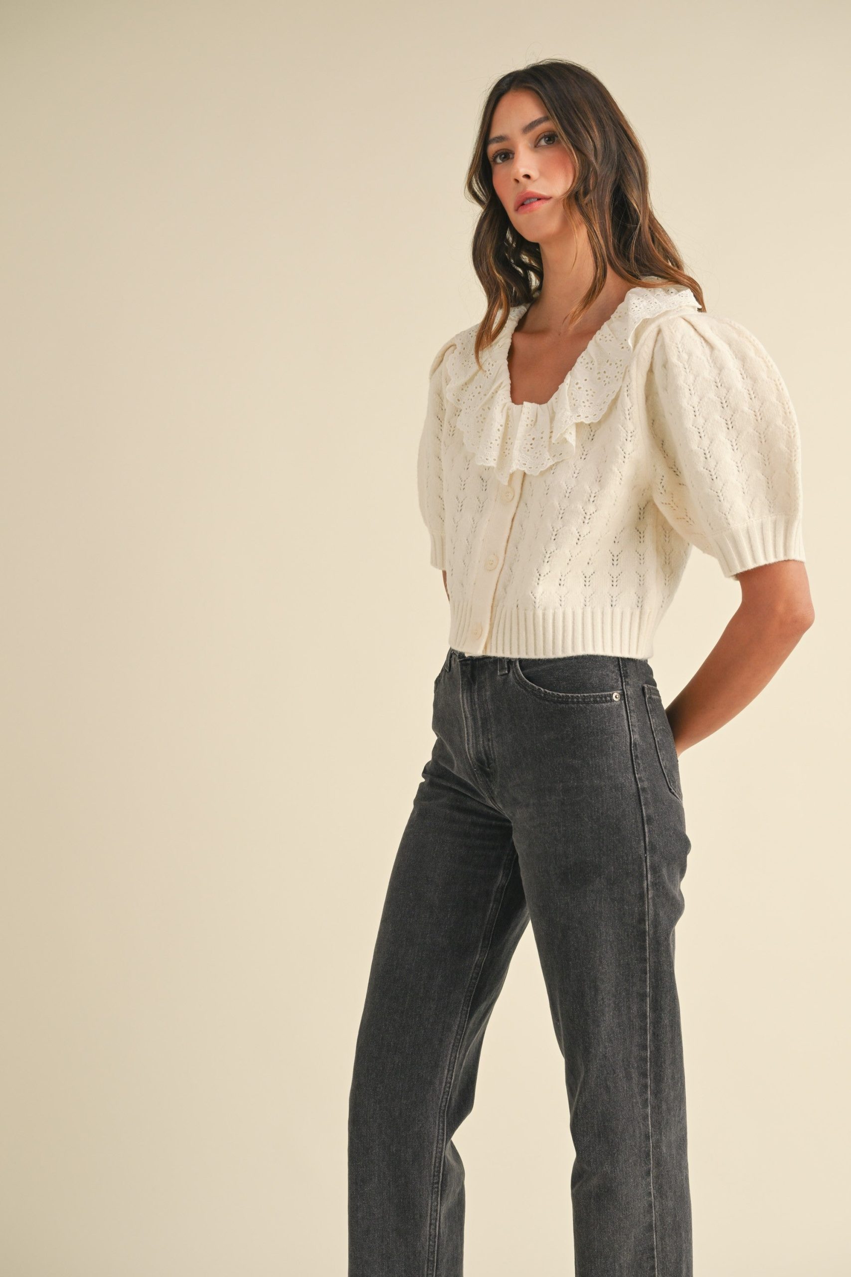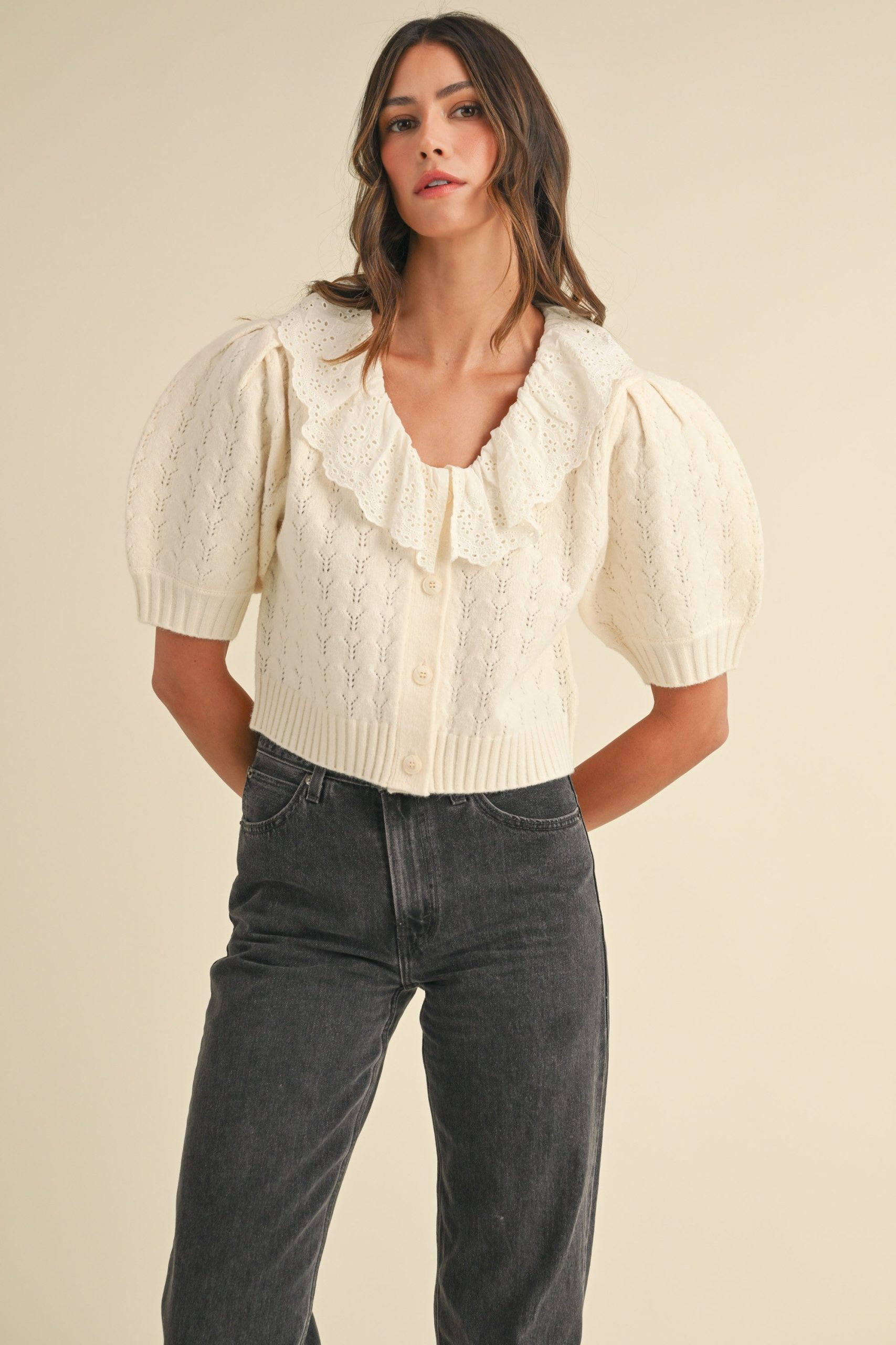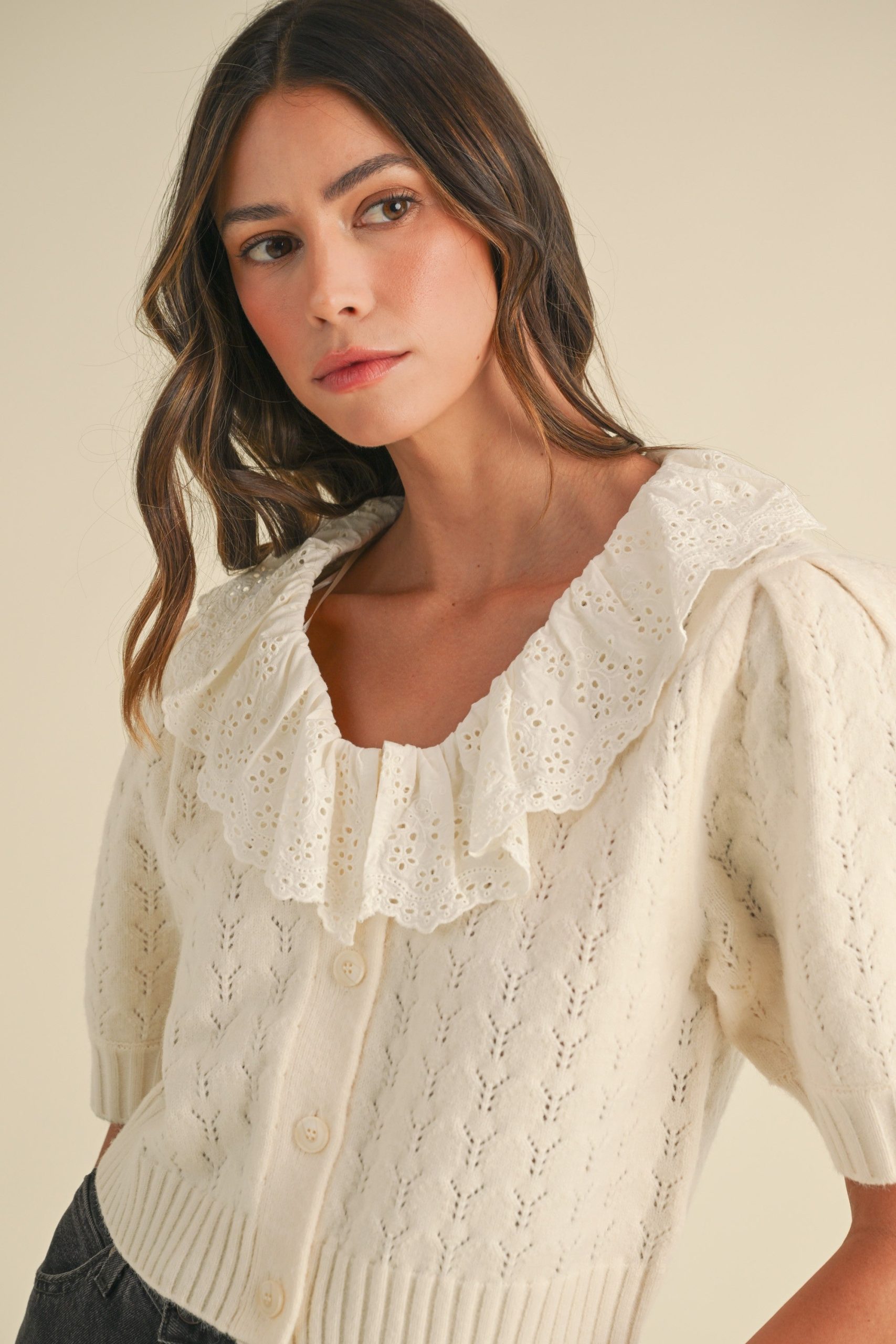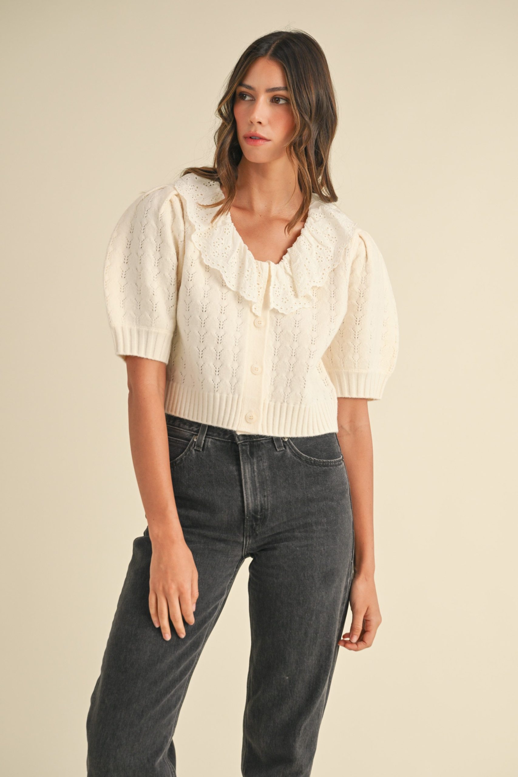 Openwork-knit Ruffled-lace Collar Cropped Cardigan