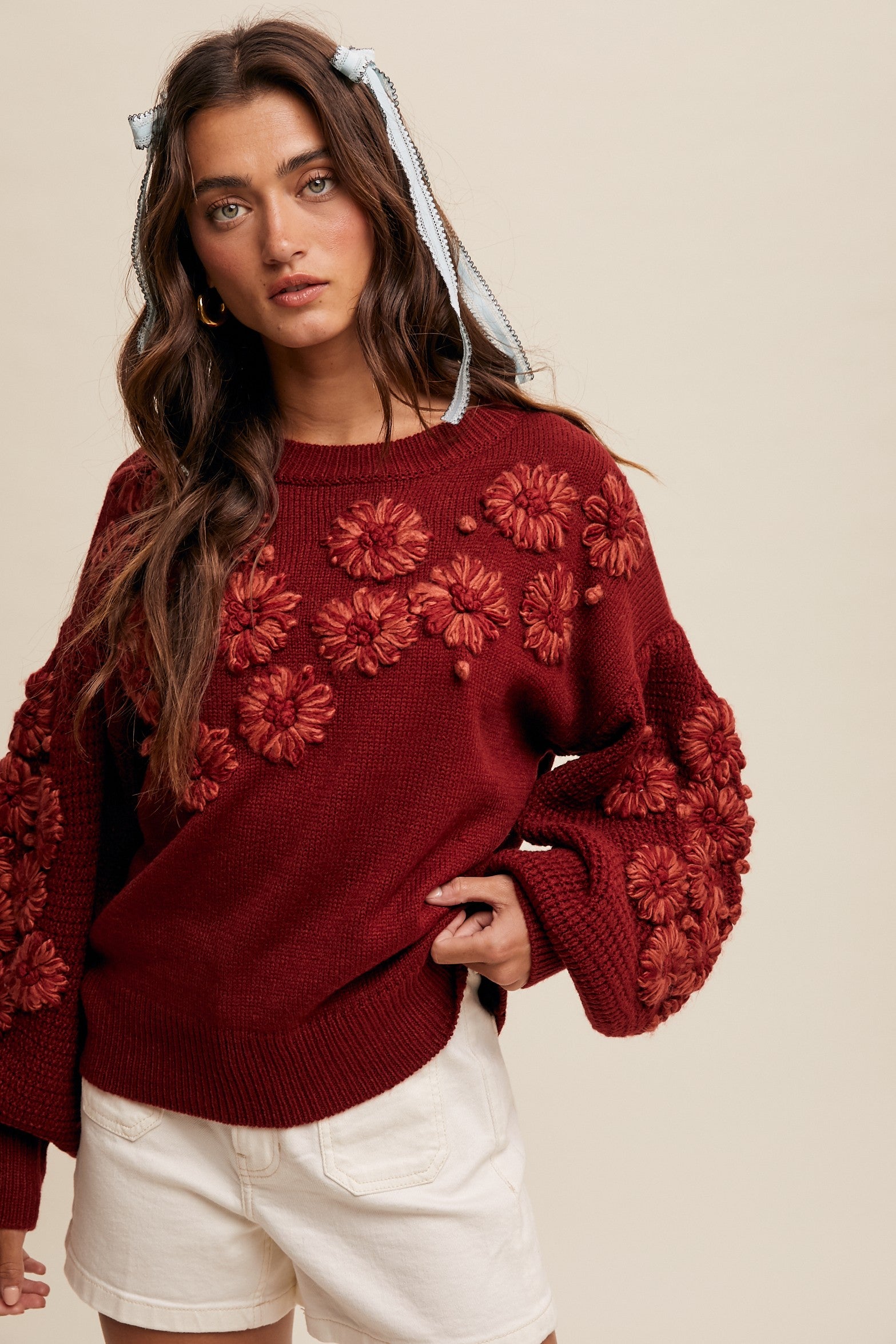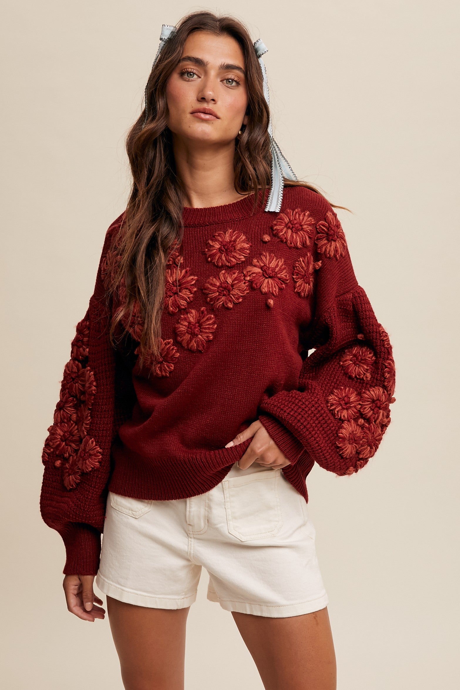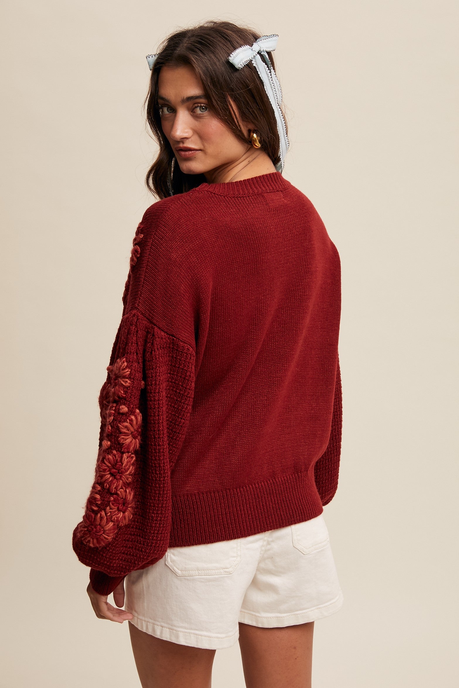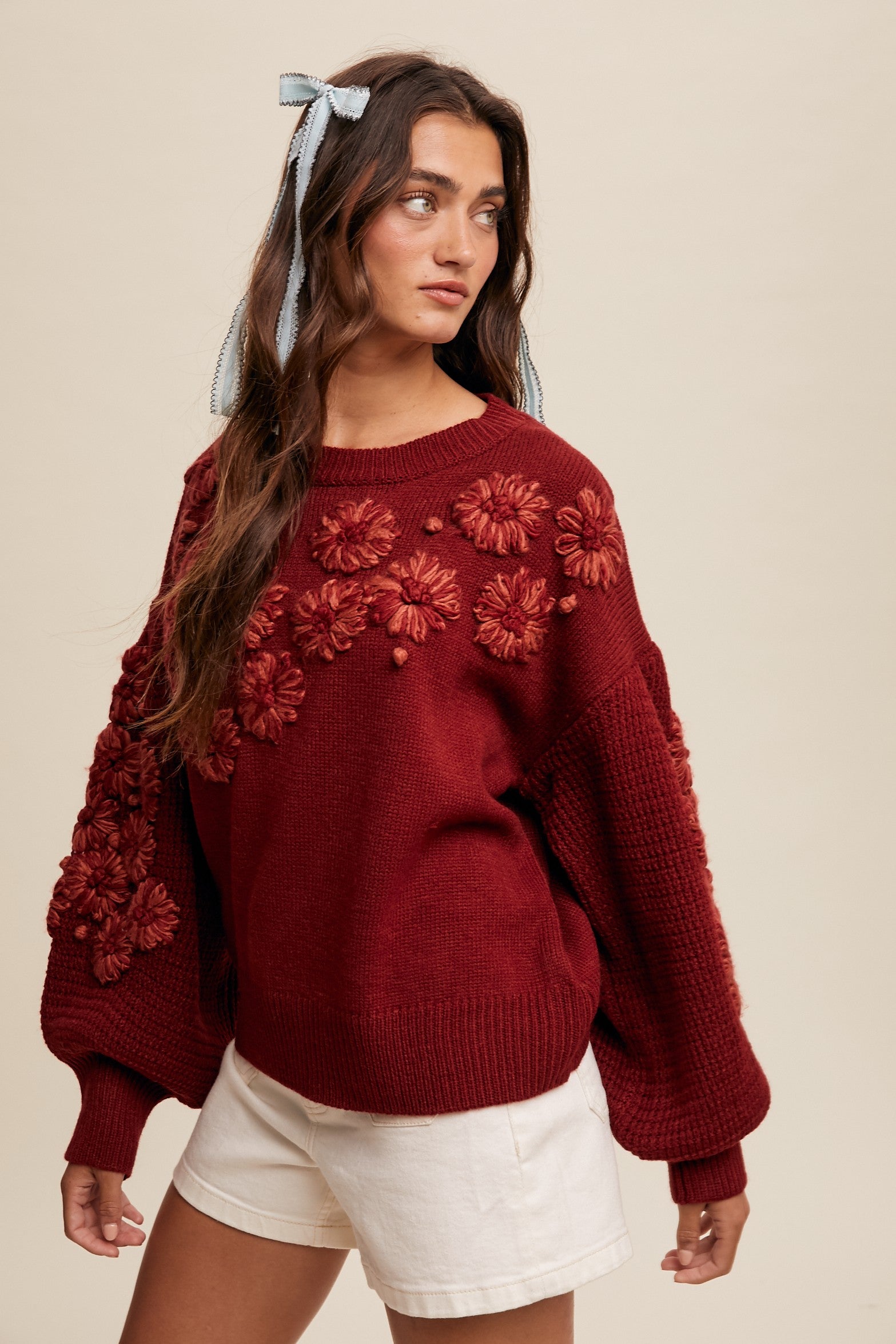 - Since the sweater is made of 100% acrylic, it’s best to hand – wash it in cold water to preserve the 3D floral detailing and the integrity of the fabric.
