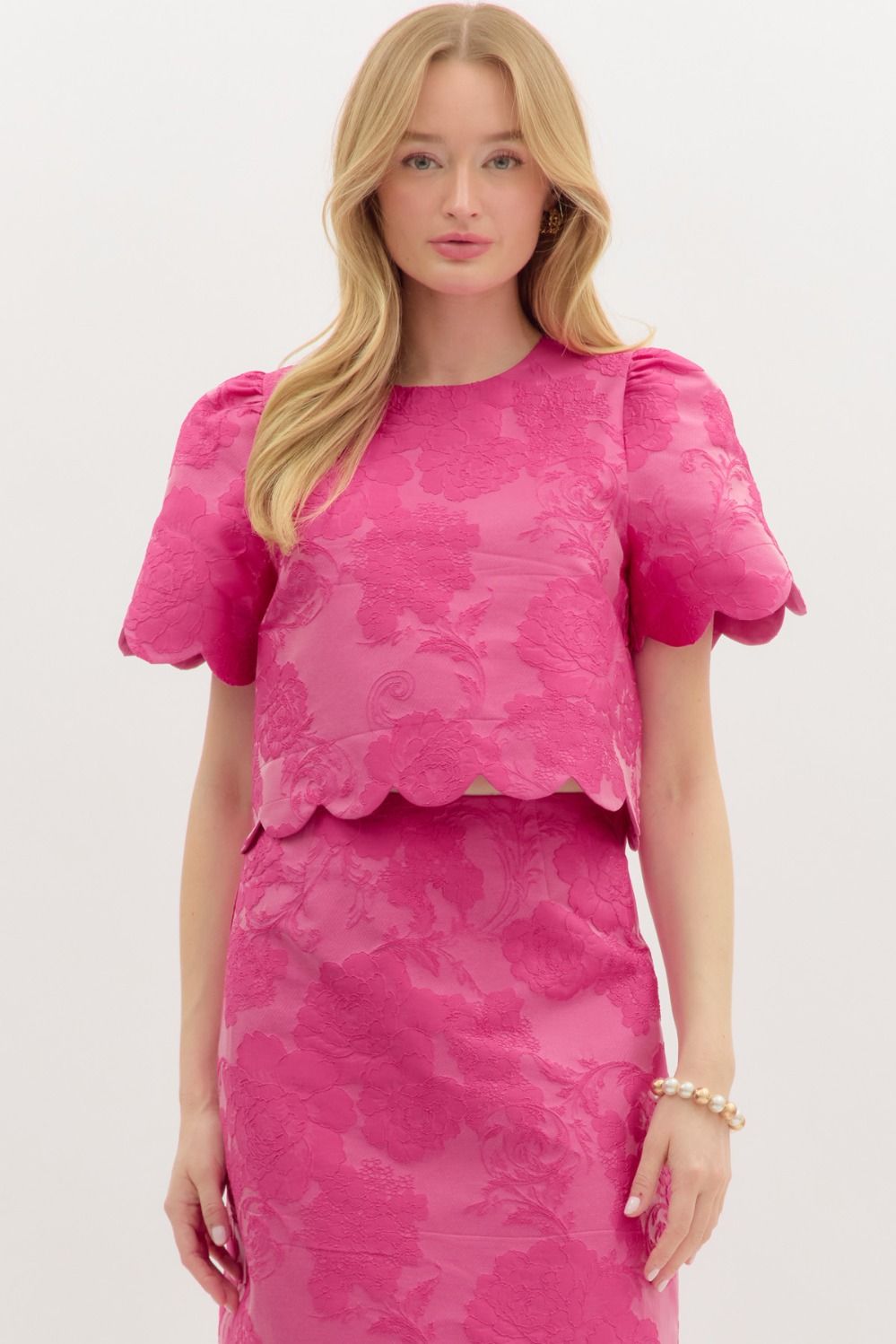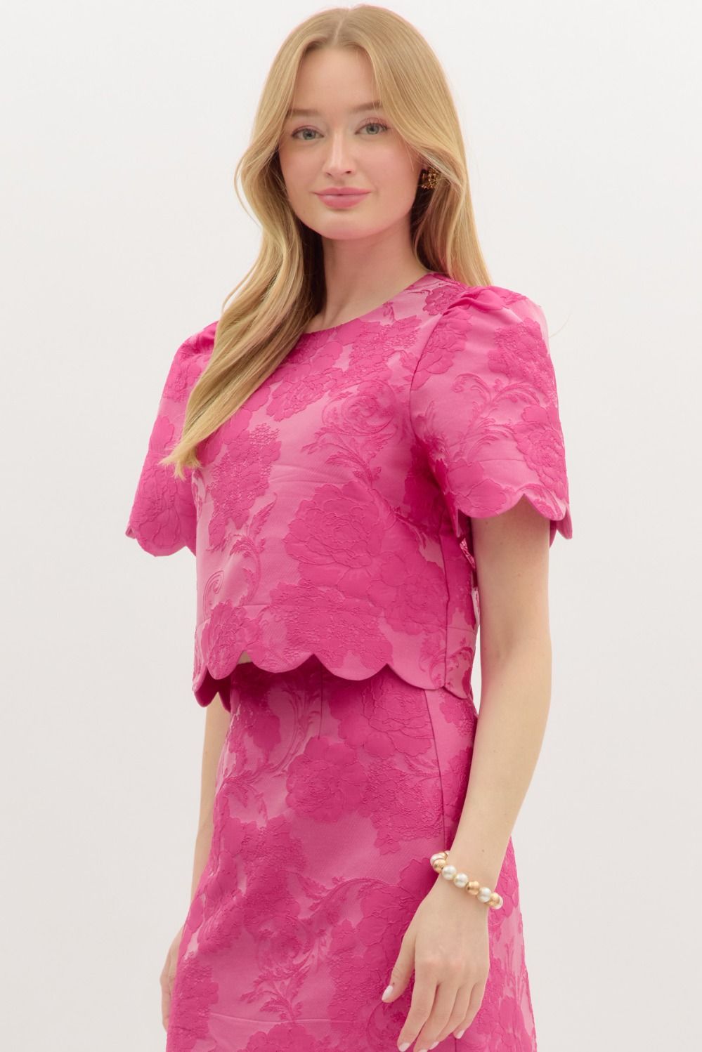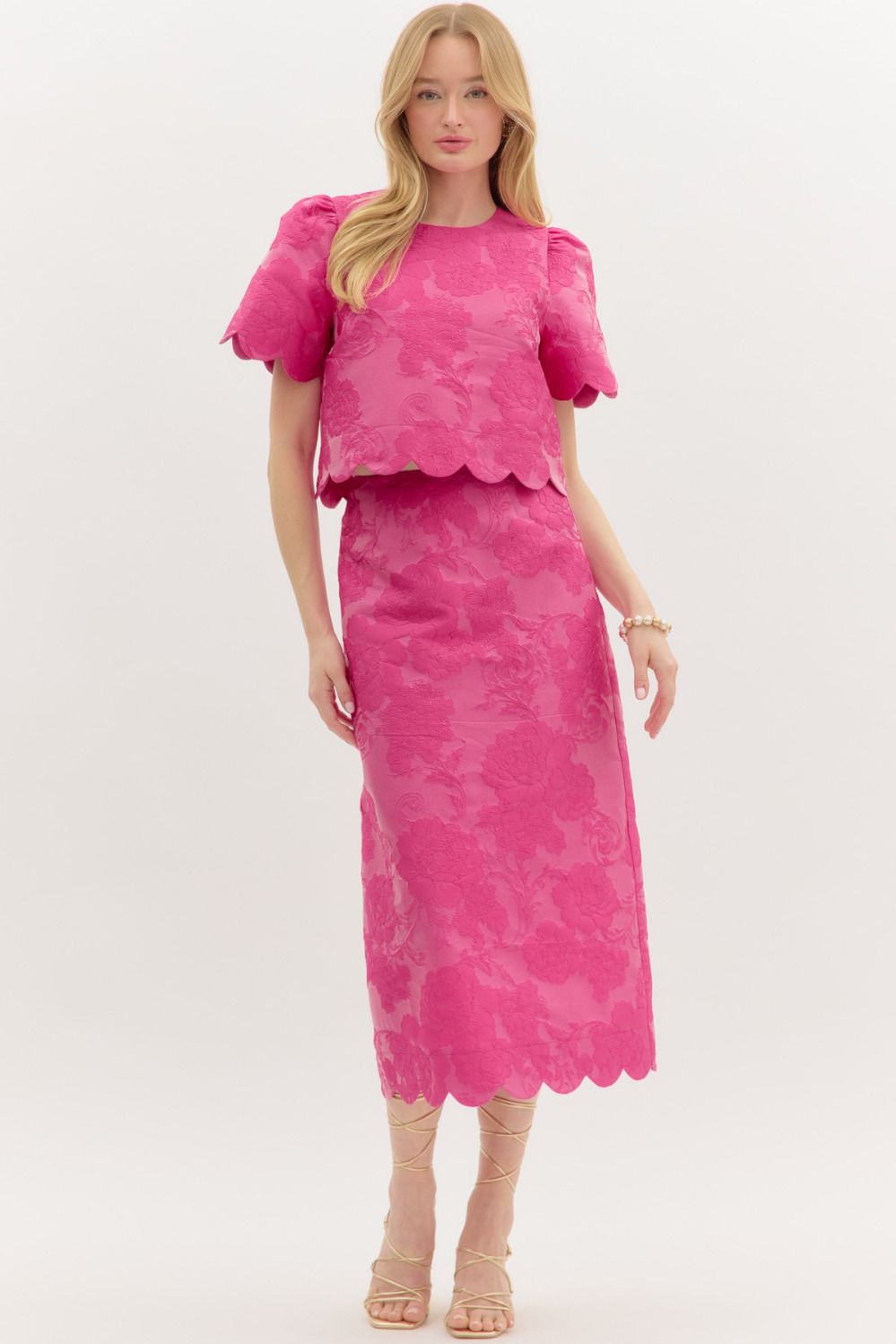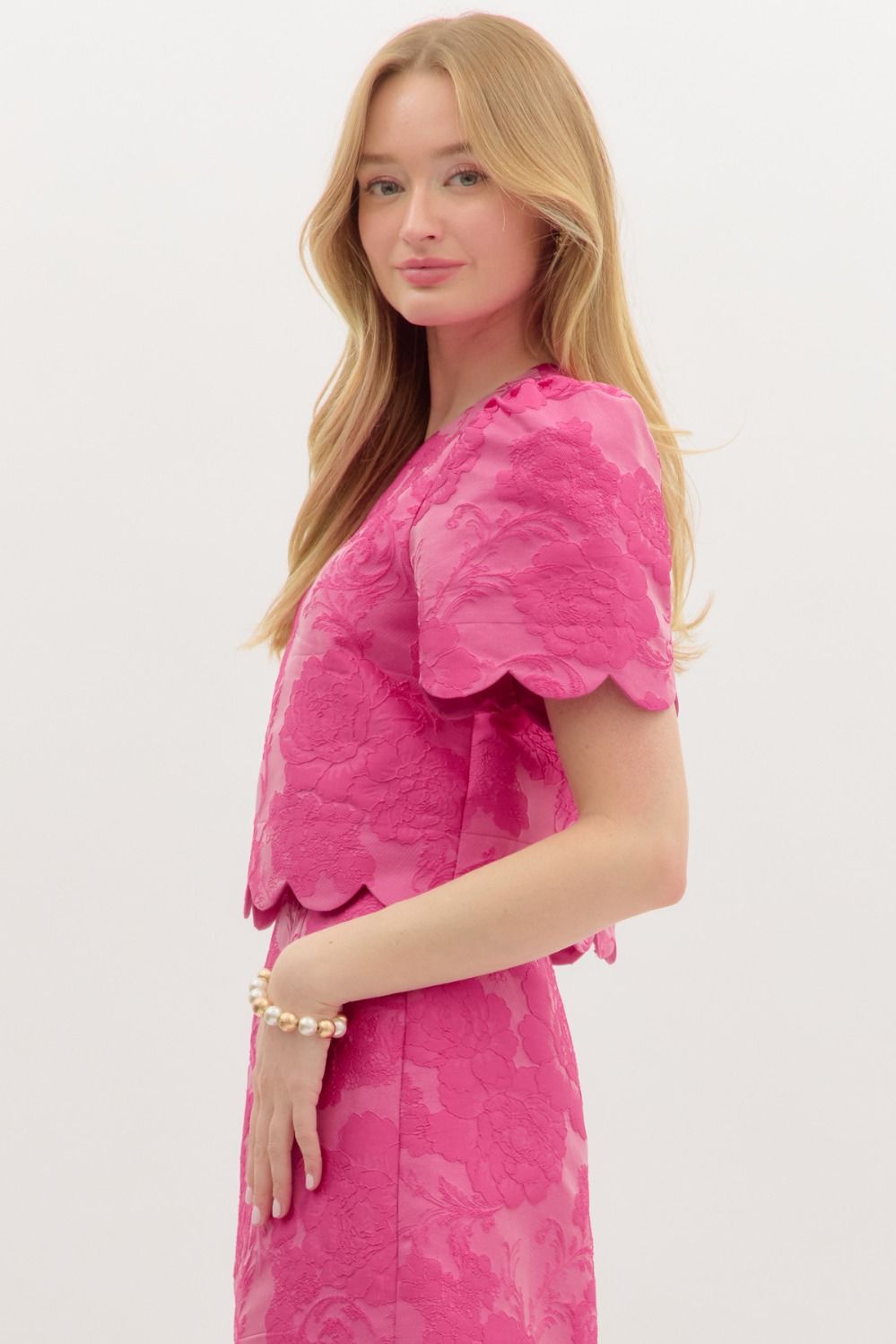 This two-piece dressy outfit is a stylish choice for women. It includes a cropped, short – sleeve top with scalloped edges and a matching tailored skirt. The woven fabric with a floral embossed pattern, available in black and hot pink, gives it a formal and elegant look.