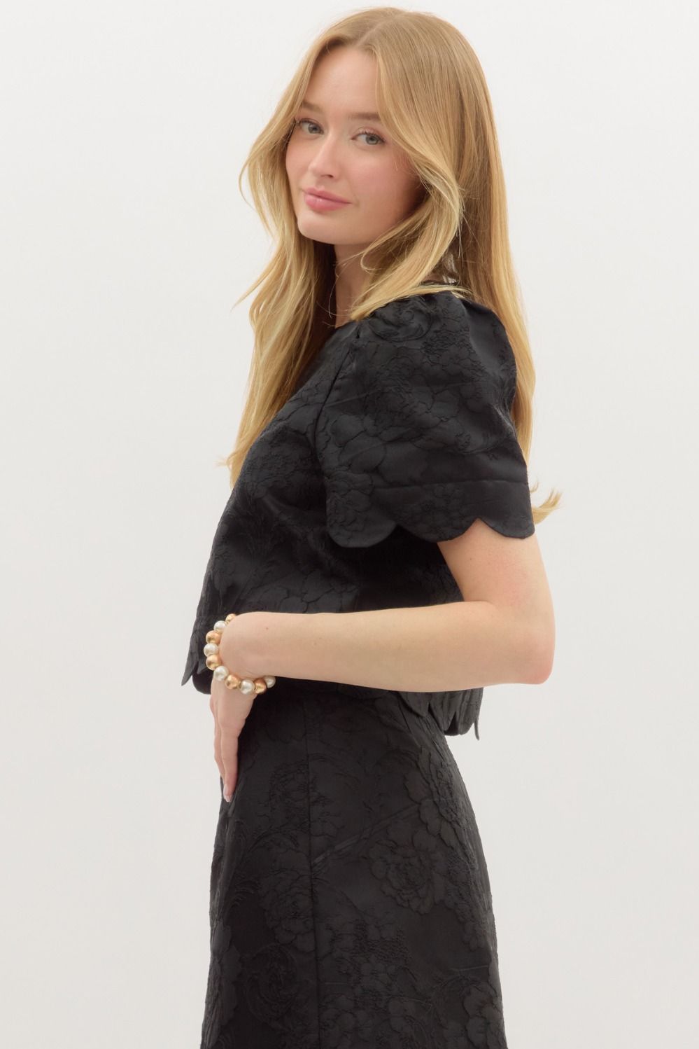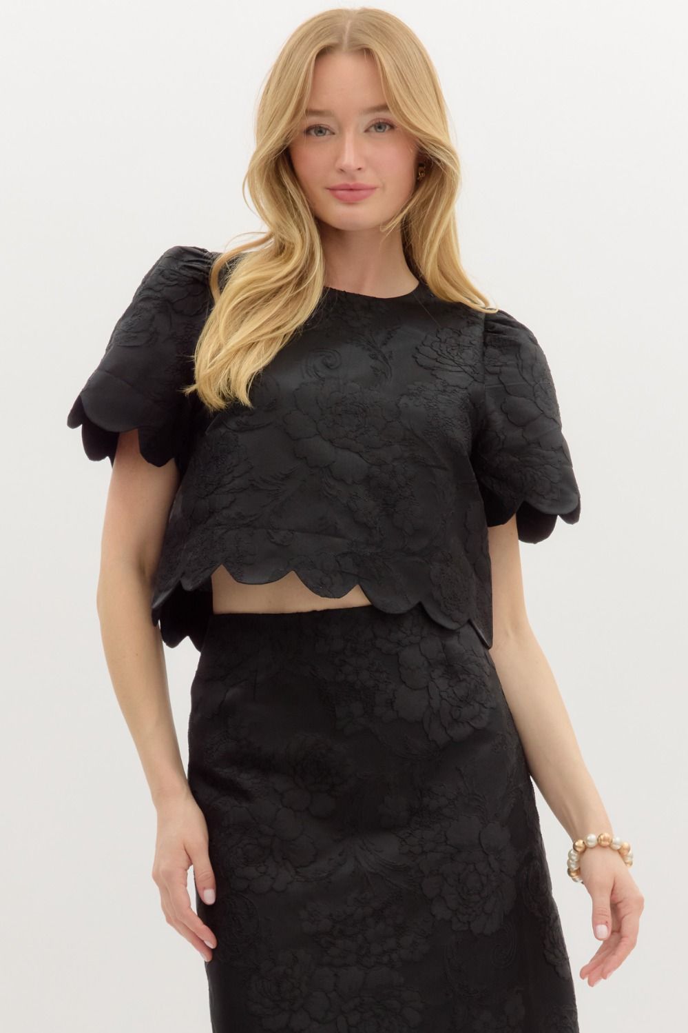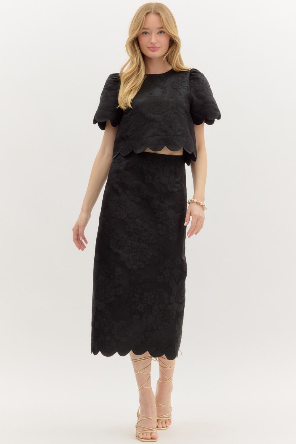 This two-piece dressy outfit is a stylish choice for women. It includes a cropped, short – sleeve top with scalloped edges and a matching tailored skirt. The woven fabric with a floral embossed pattern, available in black and hot pink, gives it a formal and elegant look.