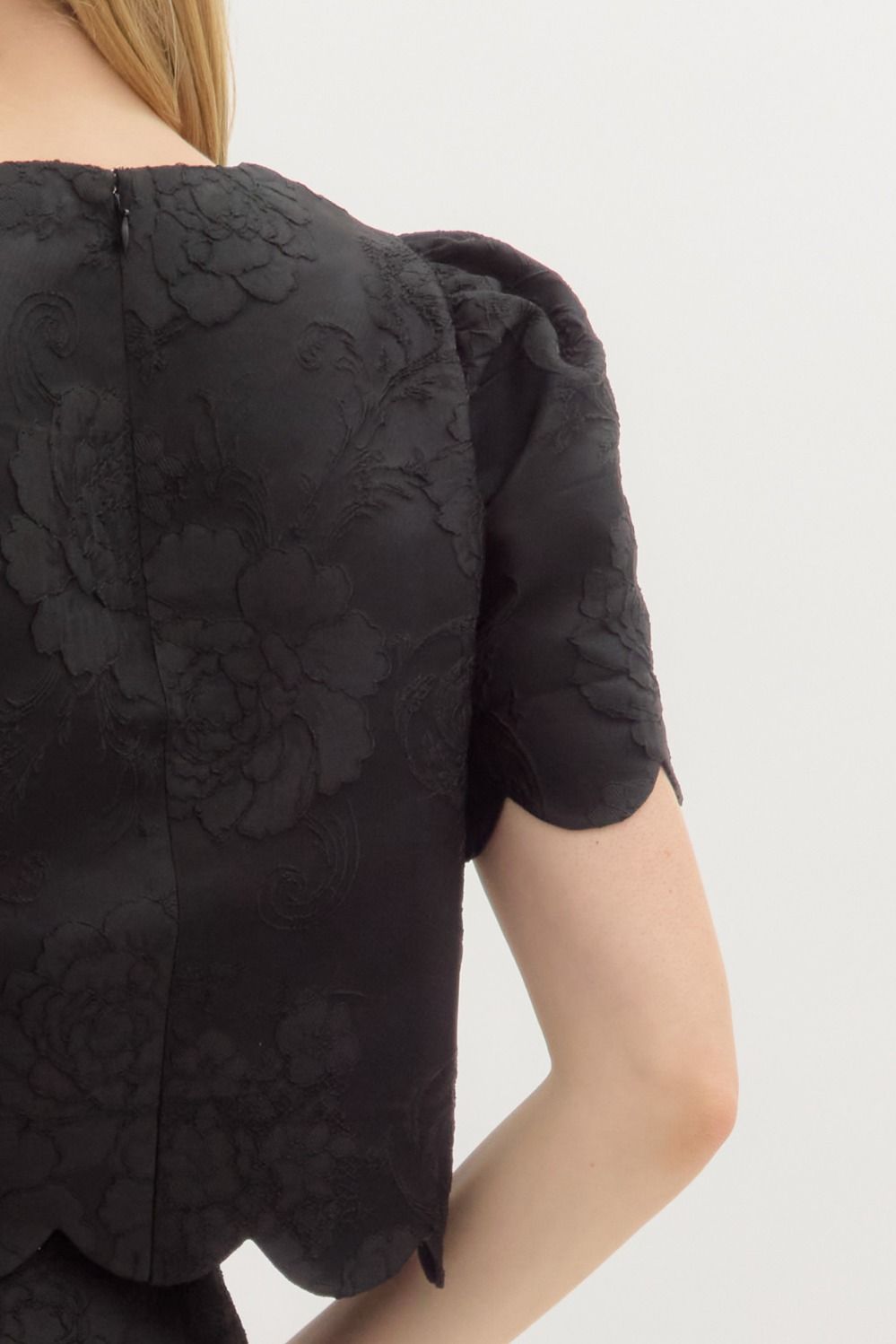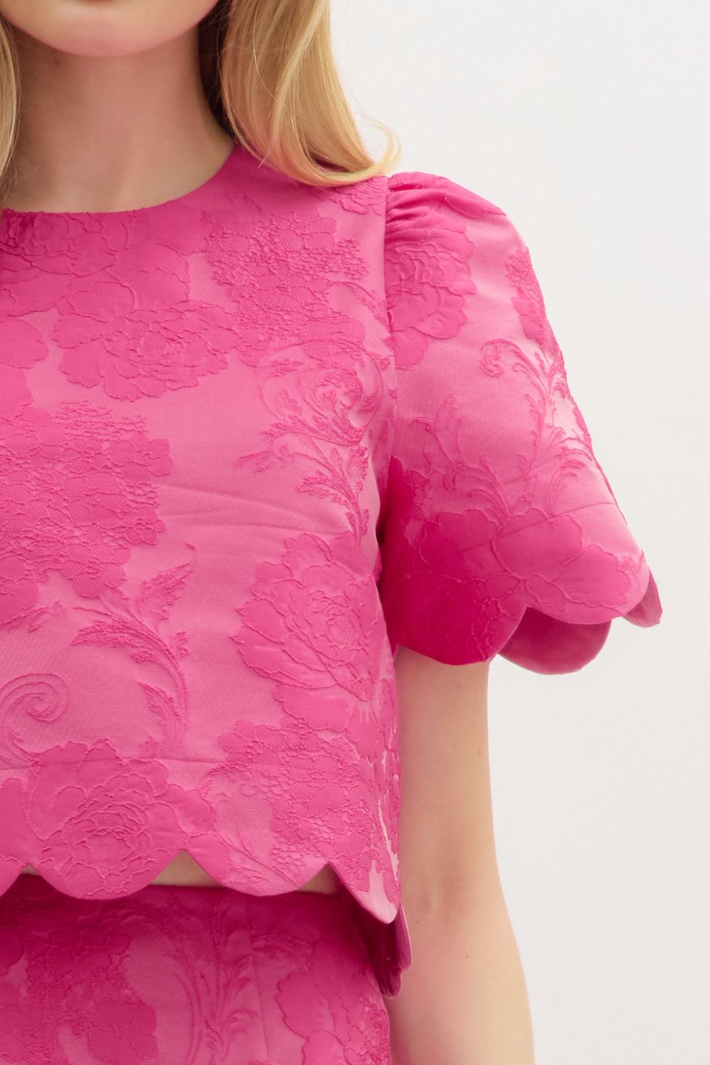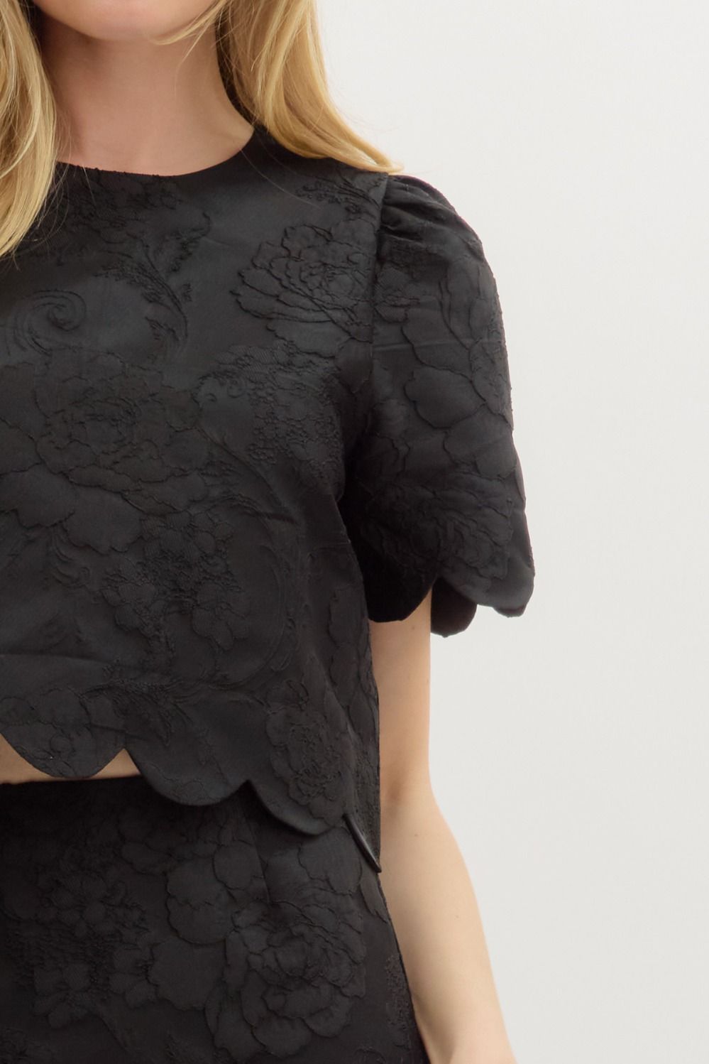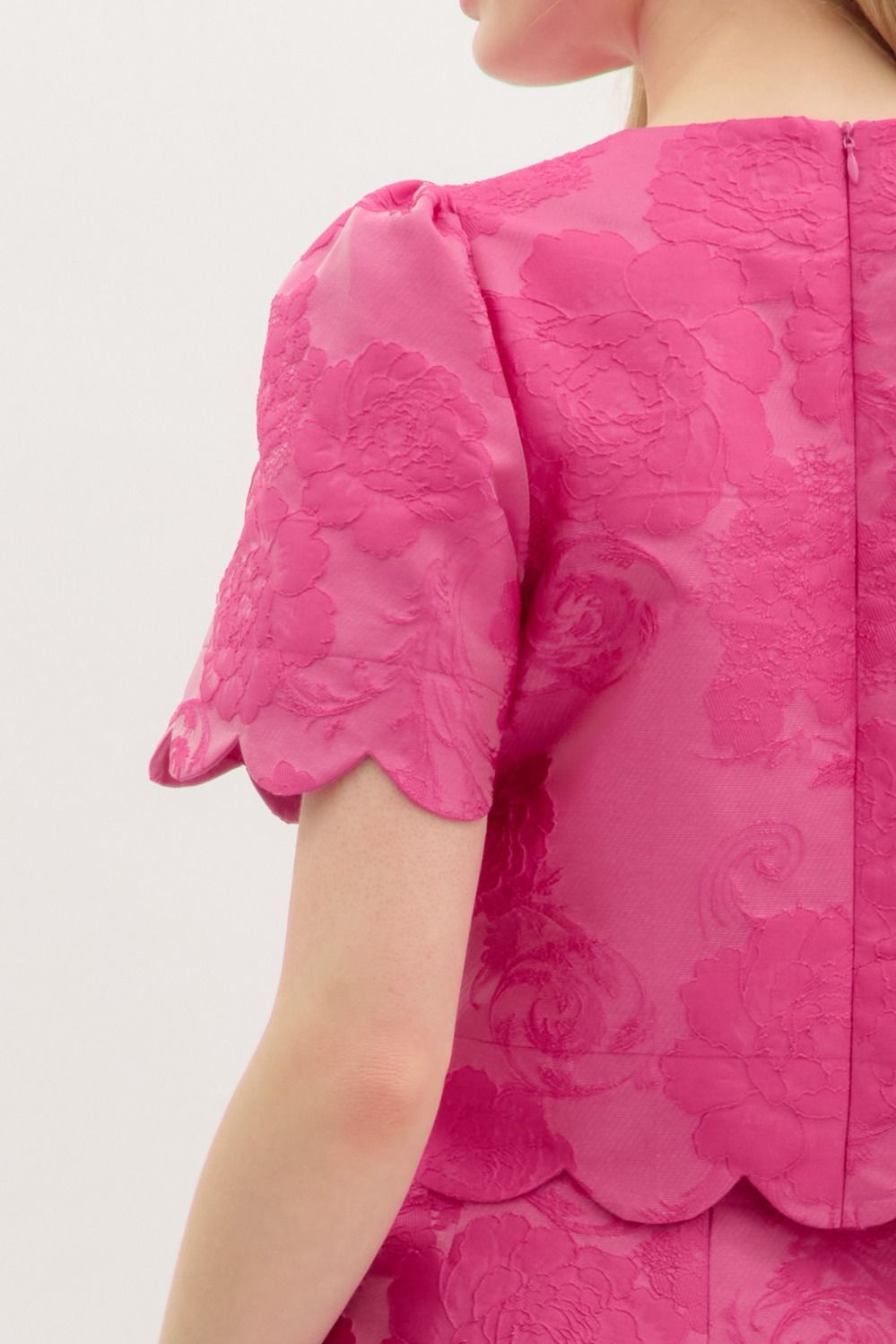 This two-piece dressy outfit is a stylish choice for women. It includes a cropped, short – sleeve top with scalloped edges and a matching tailored skirt. The woven fabric with a floral embossed pattern, available in black and hot pink, gives it a formal and elegant look.