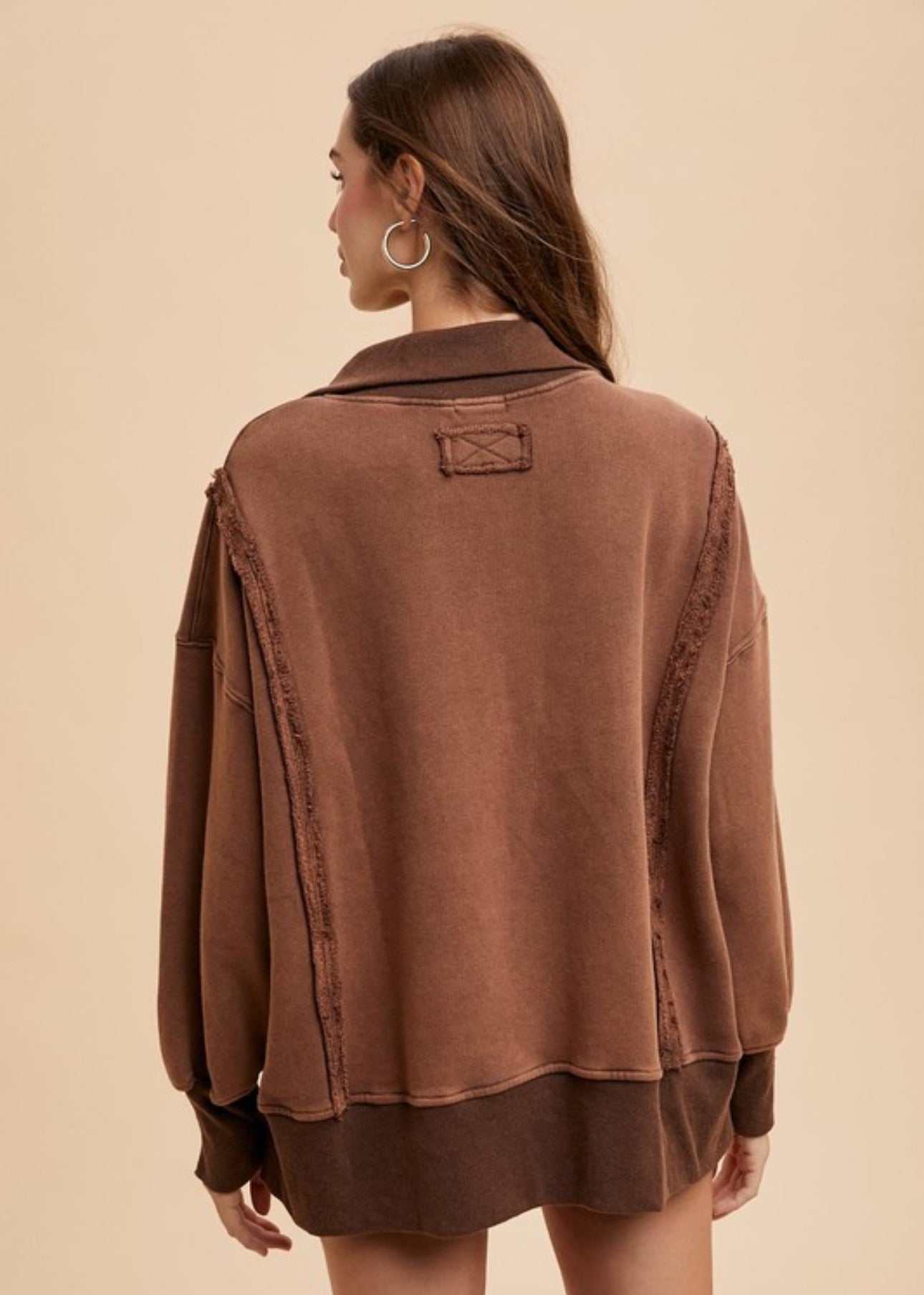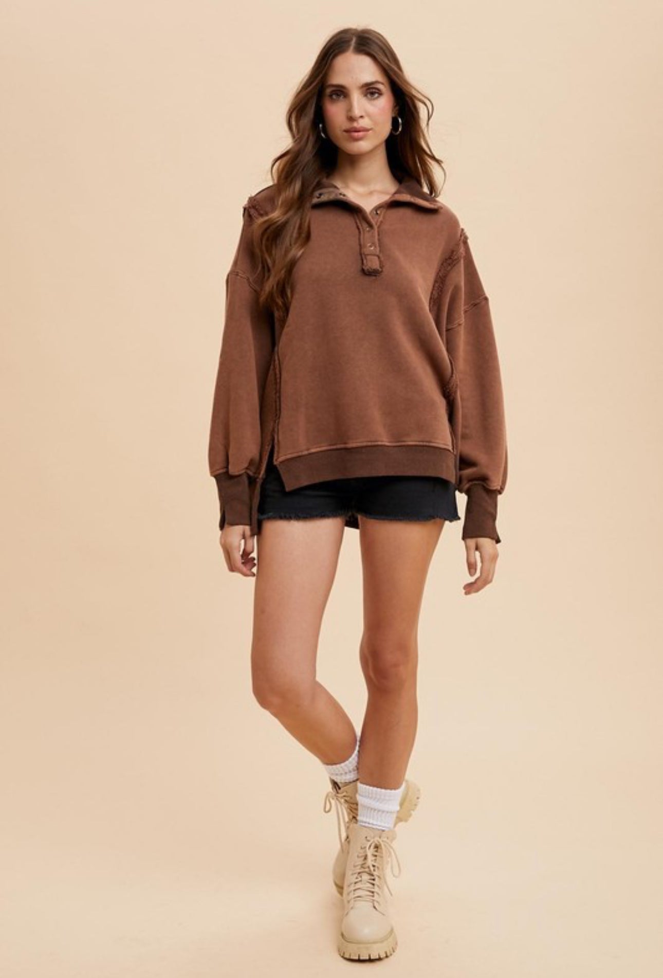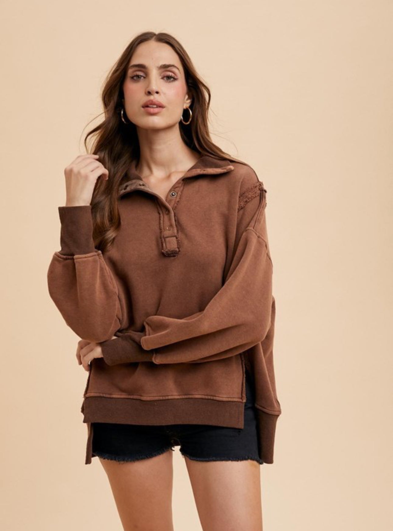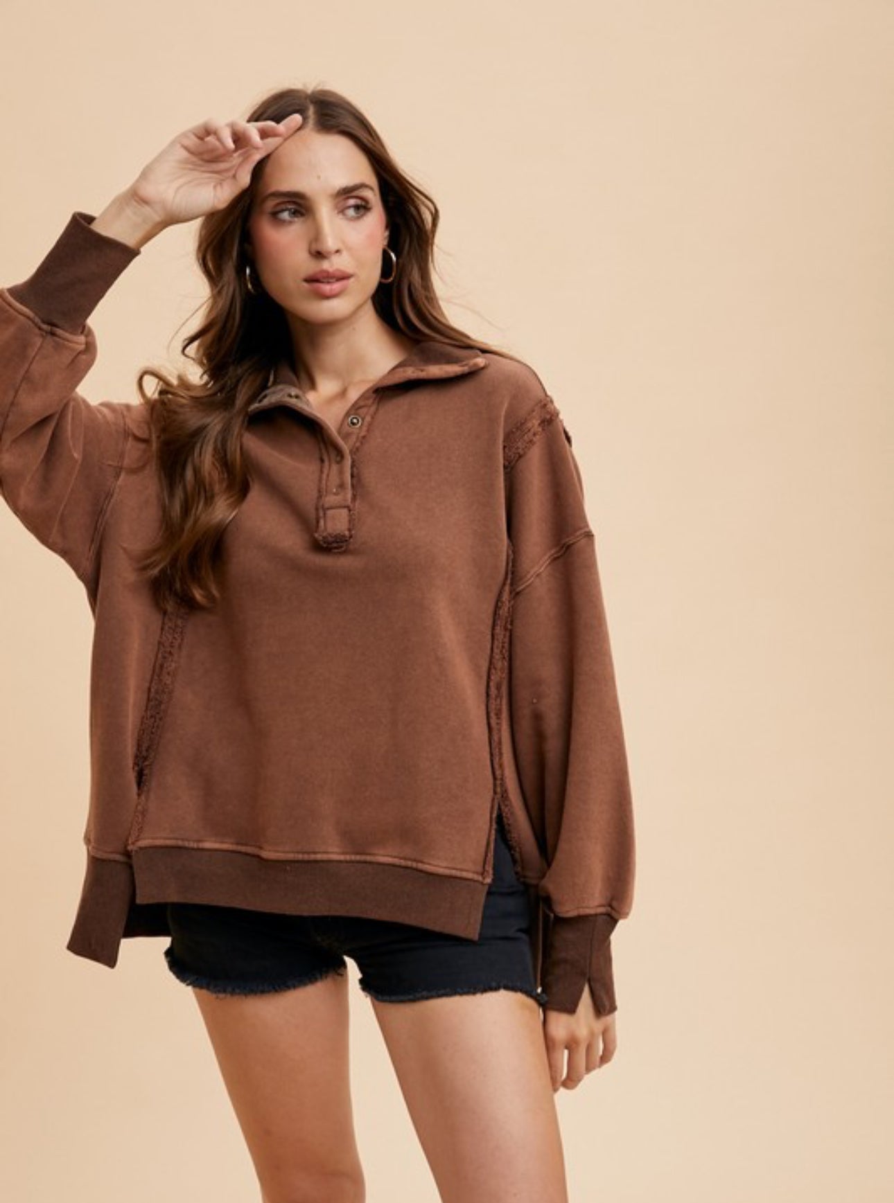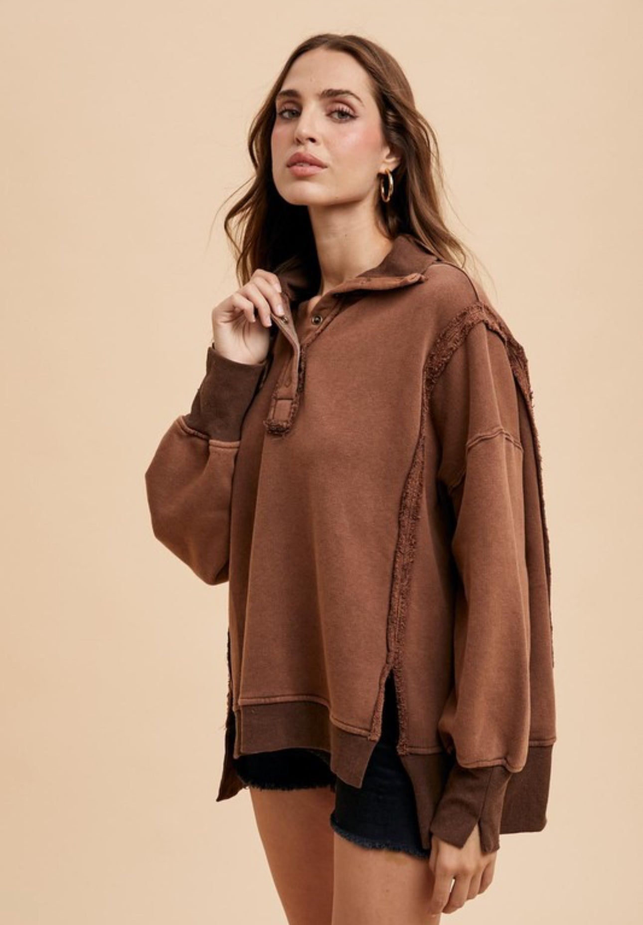 This is an oversized casual sweatshirt with a henley – style collar. It features a rich, warm brown color with a faded, vintage wash effect. The fabric is a soft cotton – blend with a slightly worn texture, and it has ribbed cuffs and hem, along with frayed raw – edge seams for a distressed aesthetic.