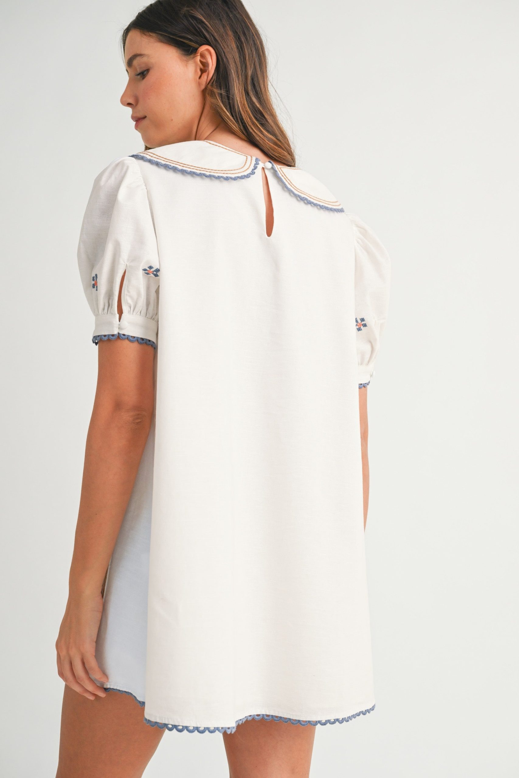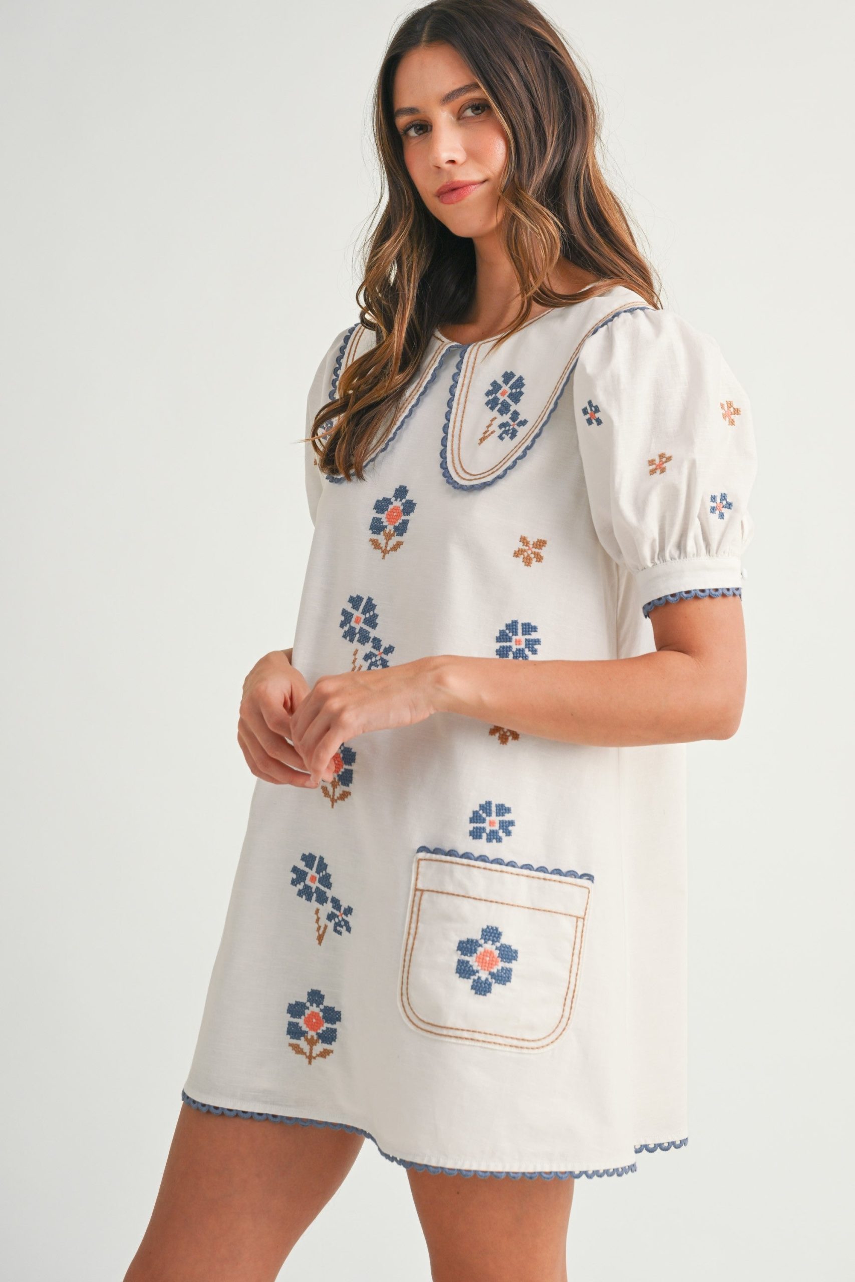 This women’s casual mini dress offers a playful, vintage-inspired aesthetic. It features a white base with intricate blue and orange floral cross – stitch embroidery. The Peter Pan collar with blue scalloped trim and brown piping, along with short puffed sleeves and front pockets, add to its charming design. The back has a keyhole cutout with a button closure.