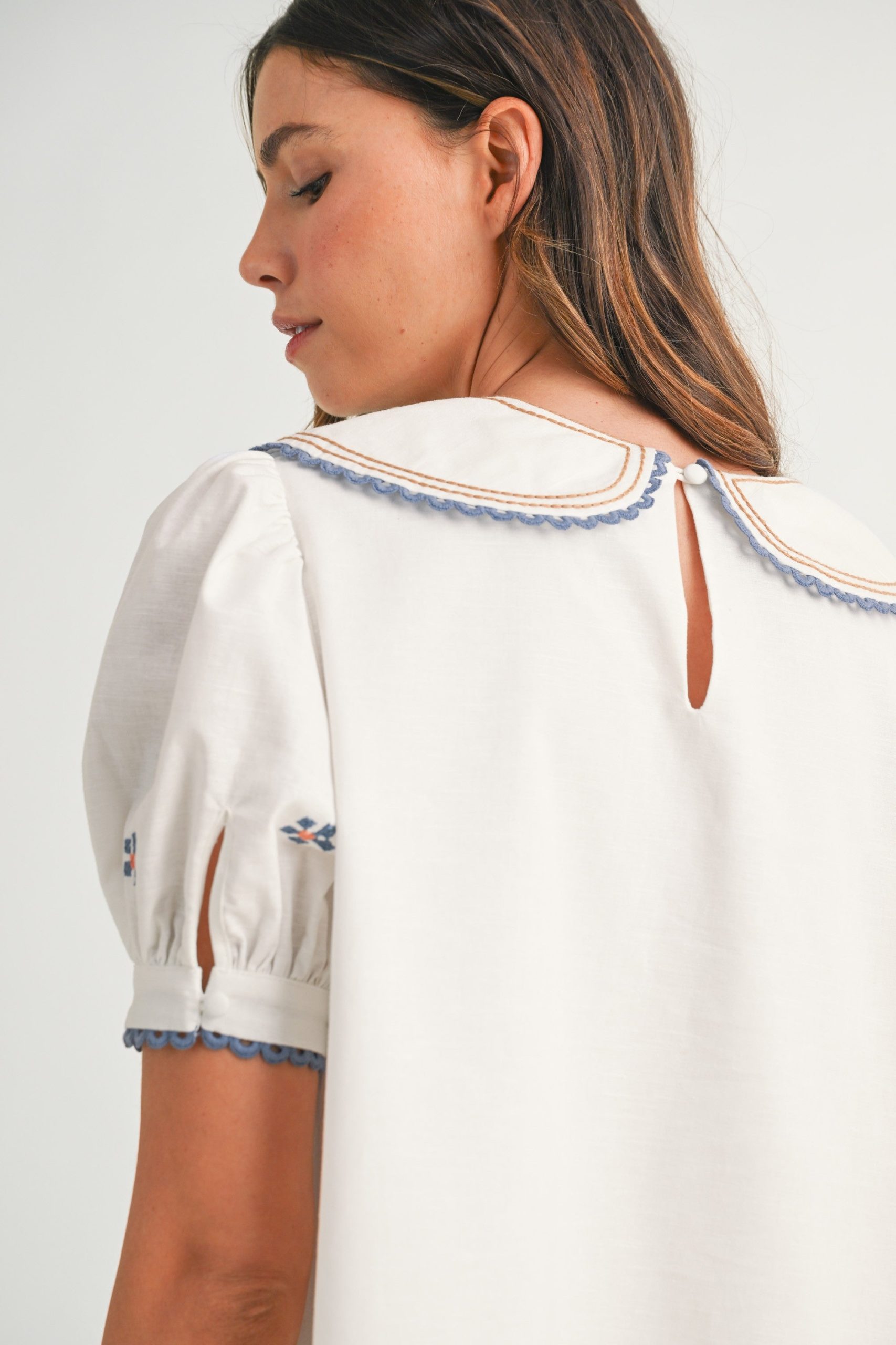 • Peter Pan – style collar with blue scalloped trim and brown piping