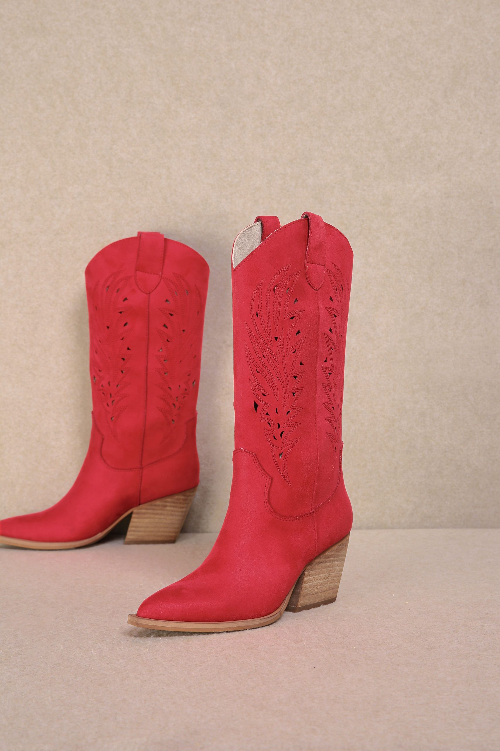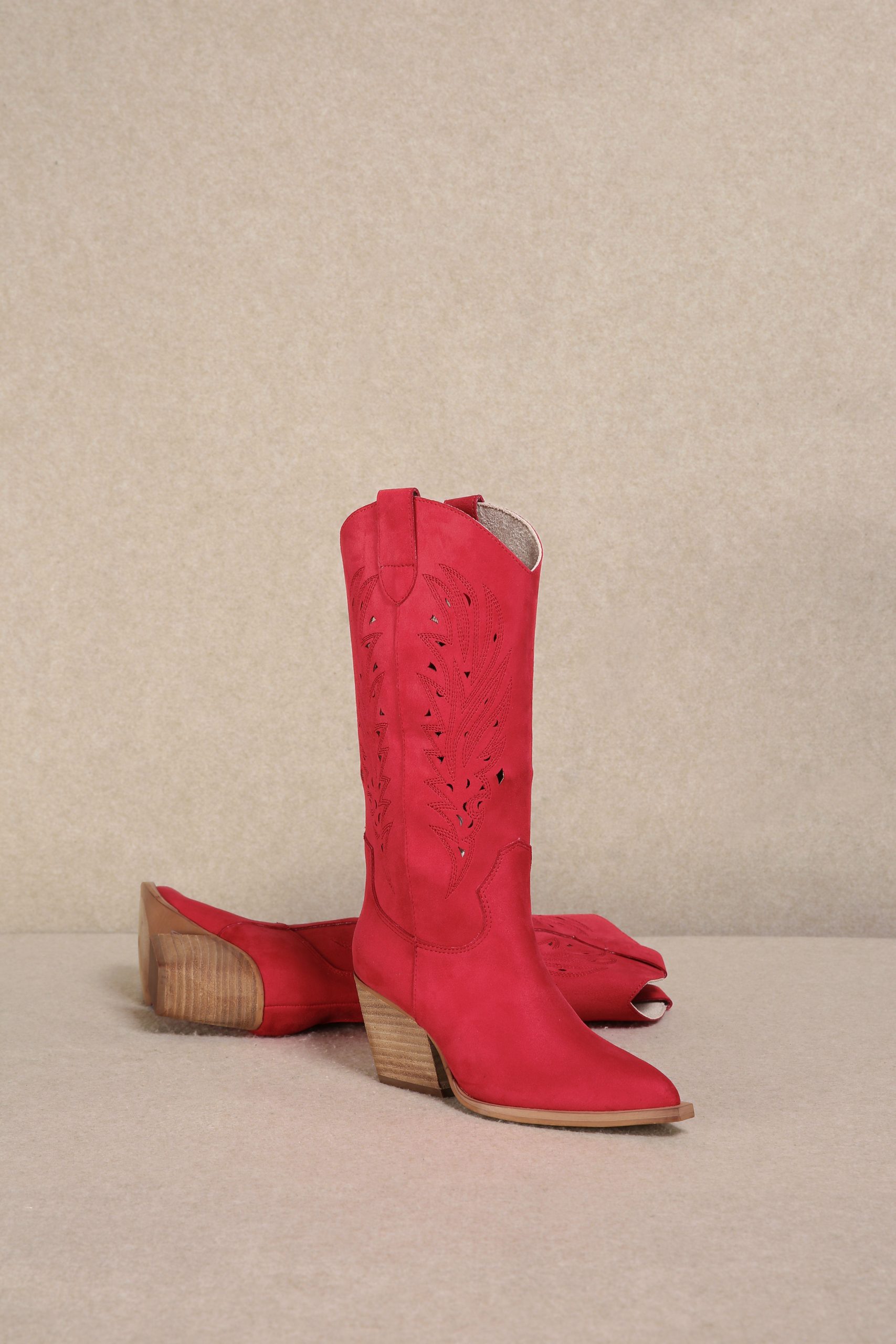 These women’s cowboy-style boots bring a bold and trendy look to your wardrobe. Crafted with a vibrant red, soft textured upper, likely suede or faux suede, they feature unique perforated leaf/floral motifs. The pointed toe, wooden block heel, and structured stitching maintain the classic Western silhouette.