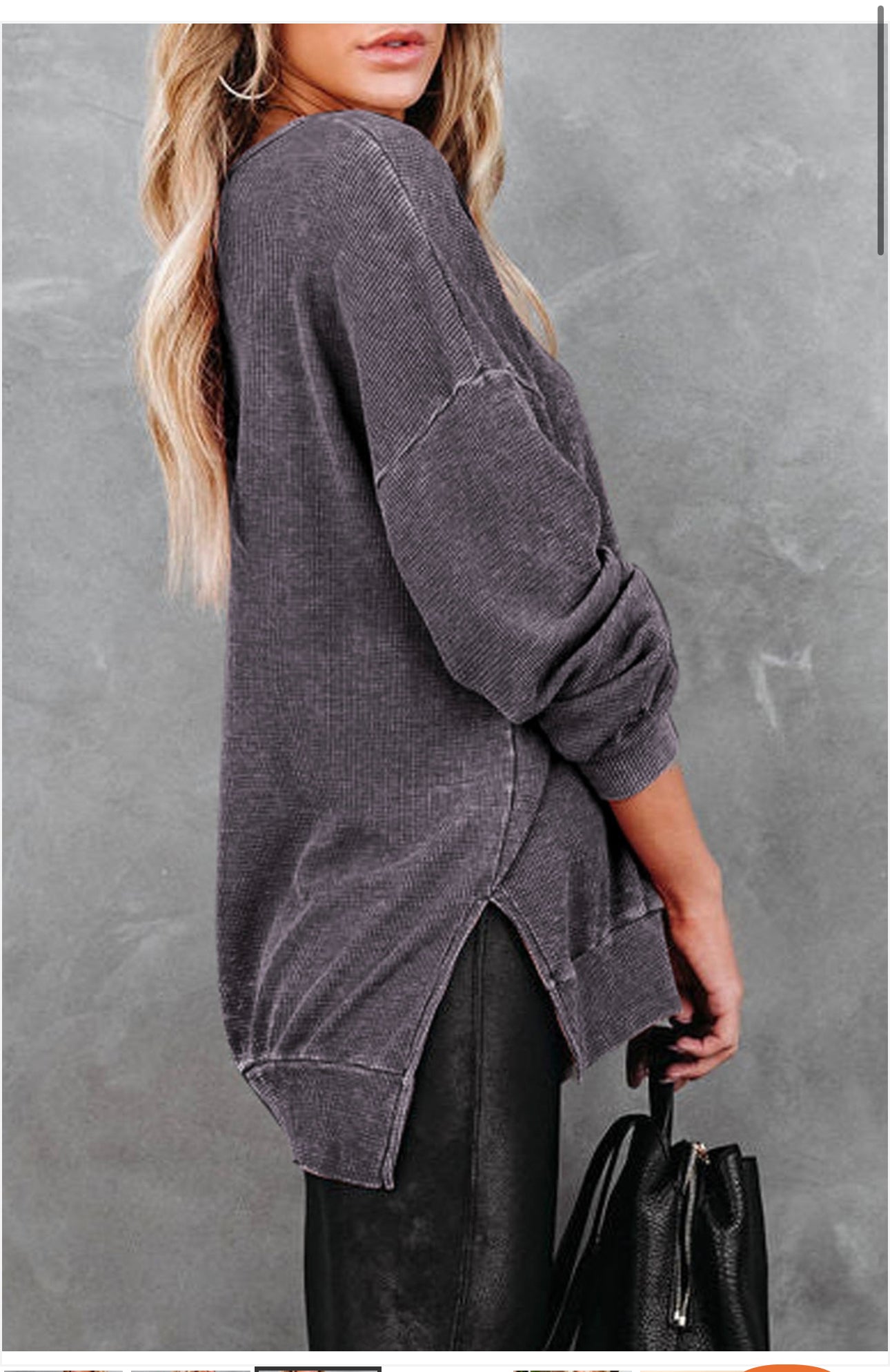 This women’s casual top is a long – sleeved sweatshirt with a relaxed, tunic – like silhouette. It features a waffle – knit fabric in a dark gray color with a vintage washed – out effect. The crew neck, loose fit, and side slits make it both comfortable and stylish for everyday wear.