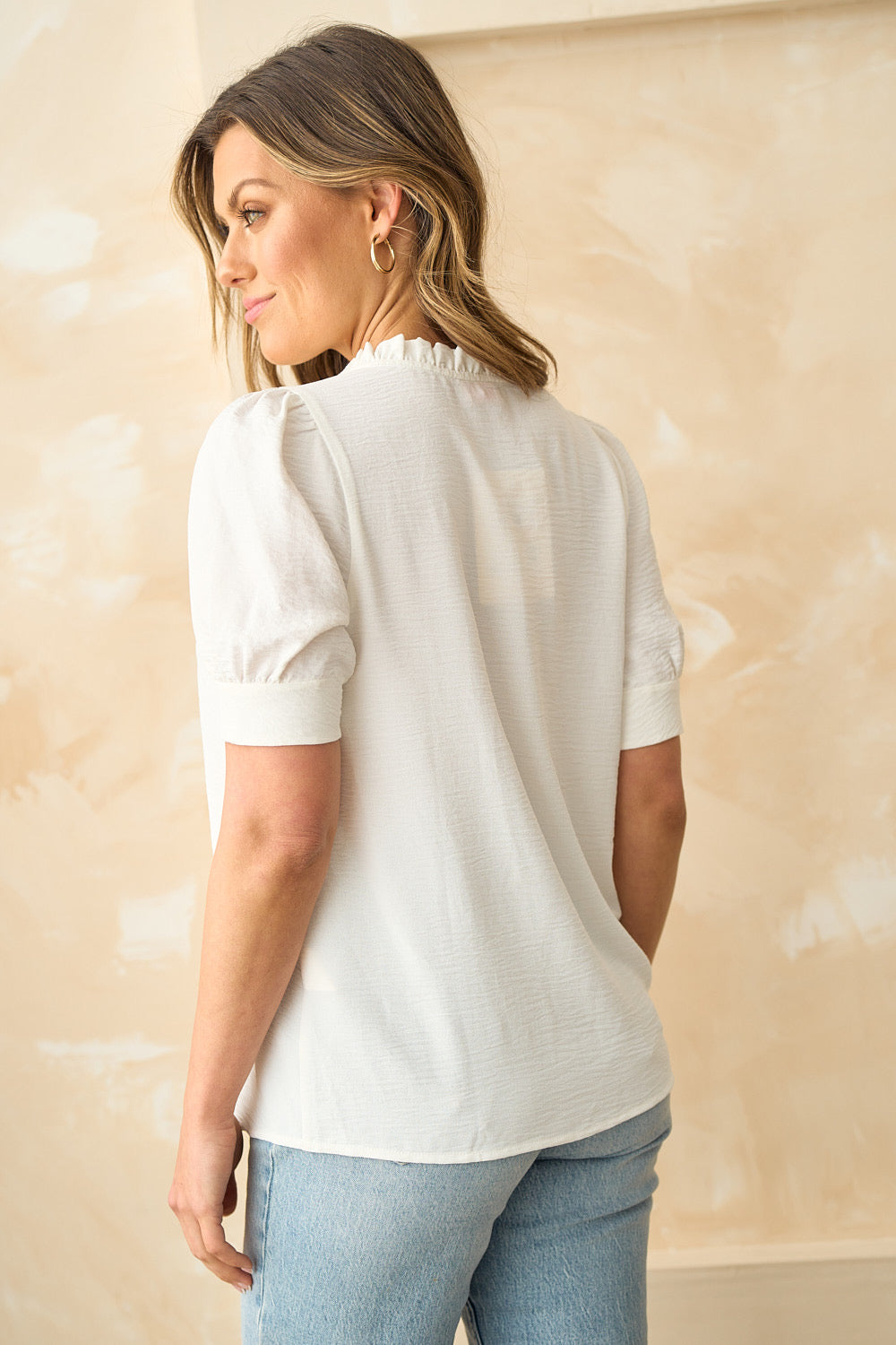 This women’s blouse is a great choice for casual, everyday wear. It features a solid white color that is both clean and versatile. The V – neck with ruffled trim and short puffed sleeves add a romantic, feminine touch, while the lightweight fabric ensures comfort in warm weather.
