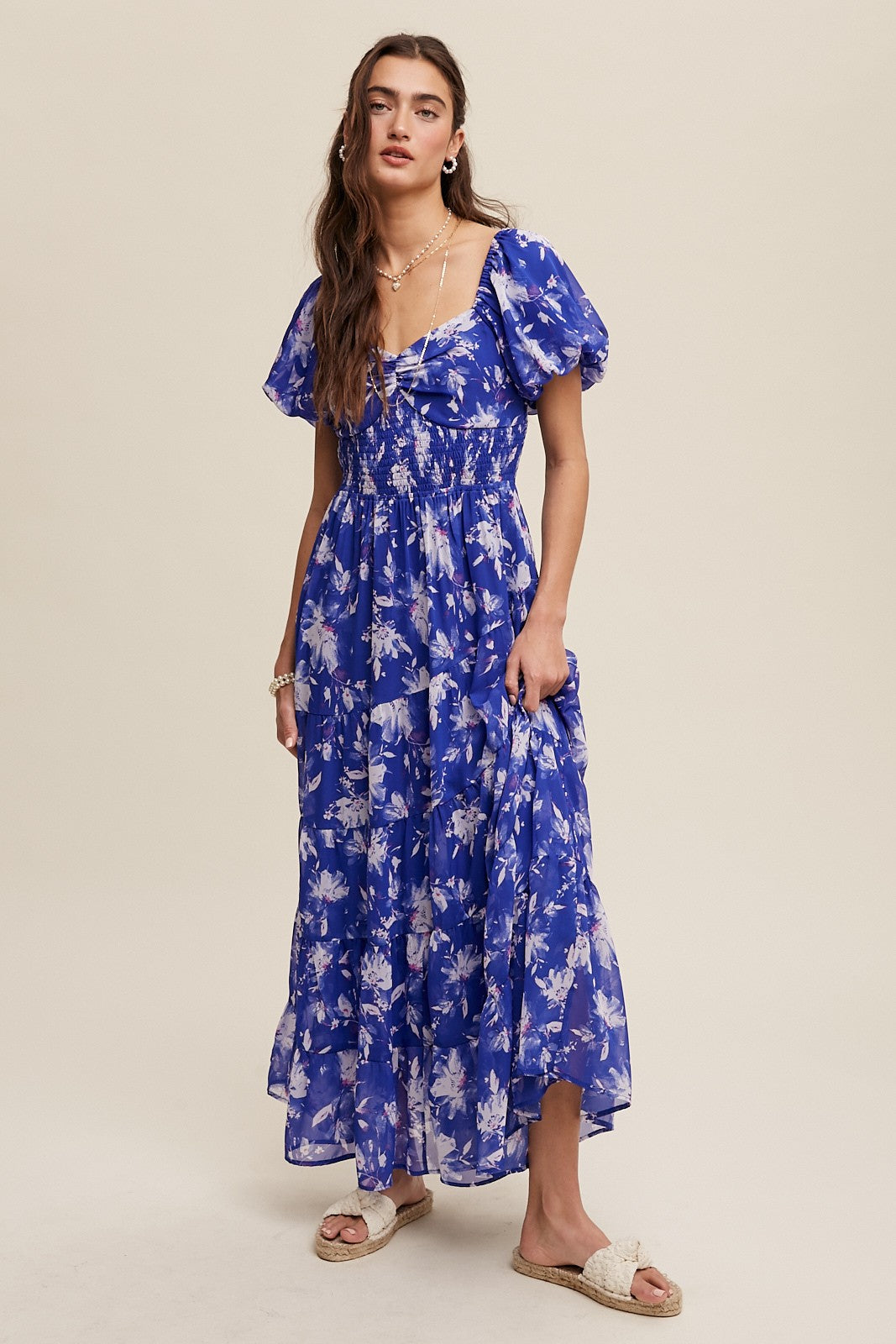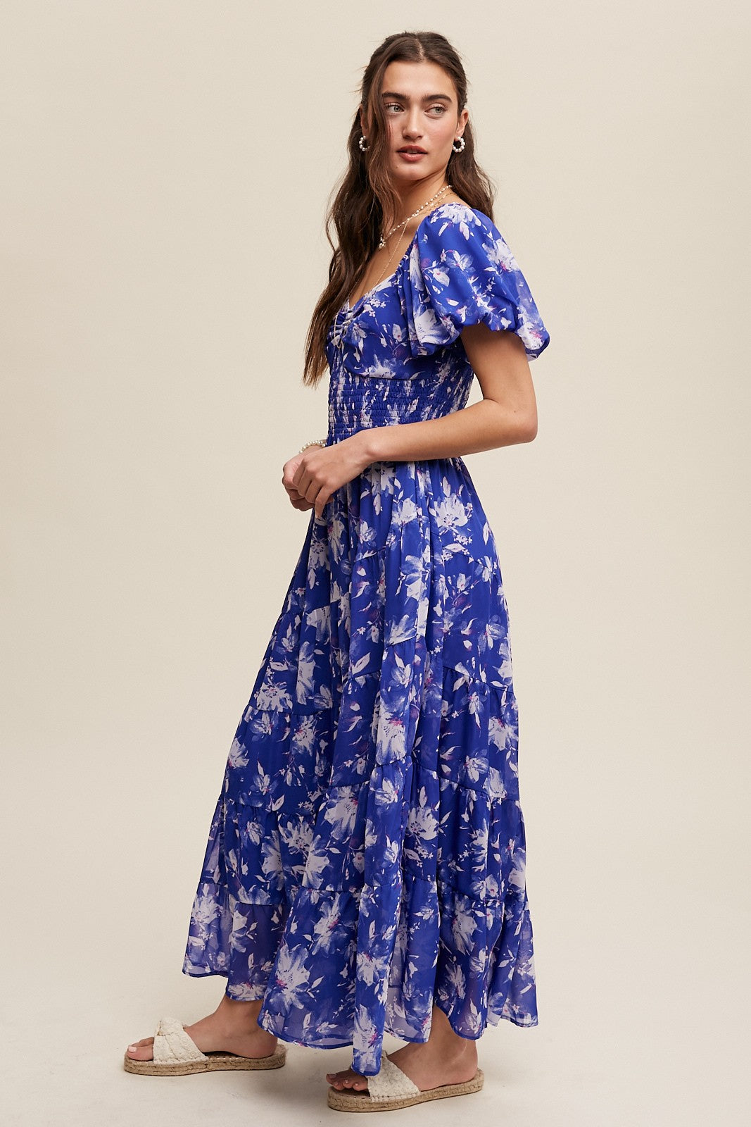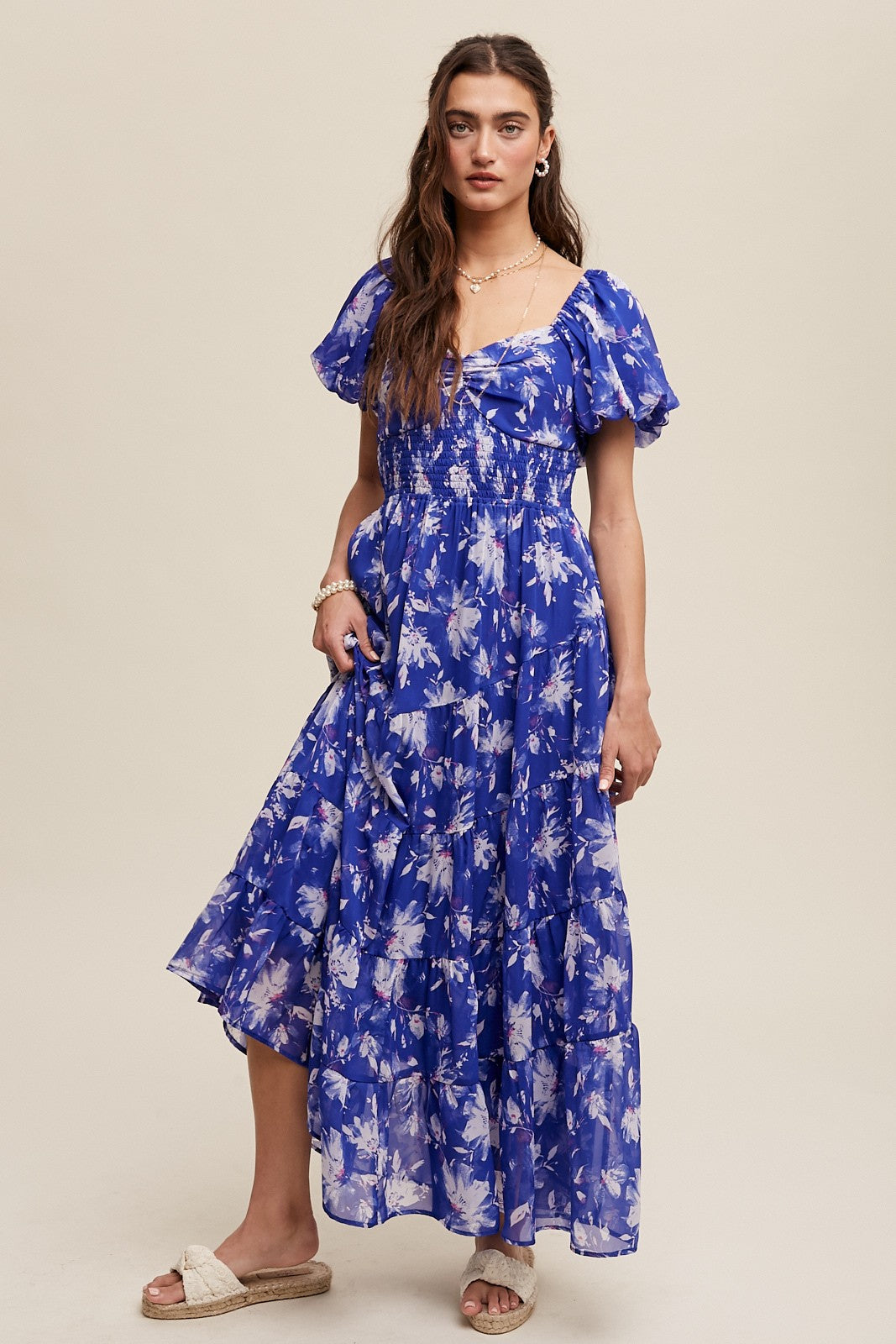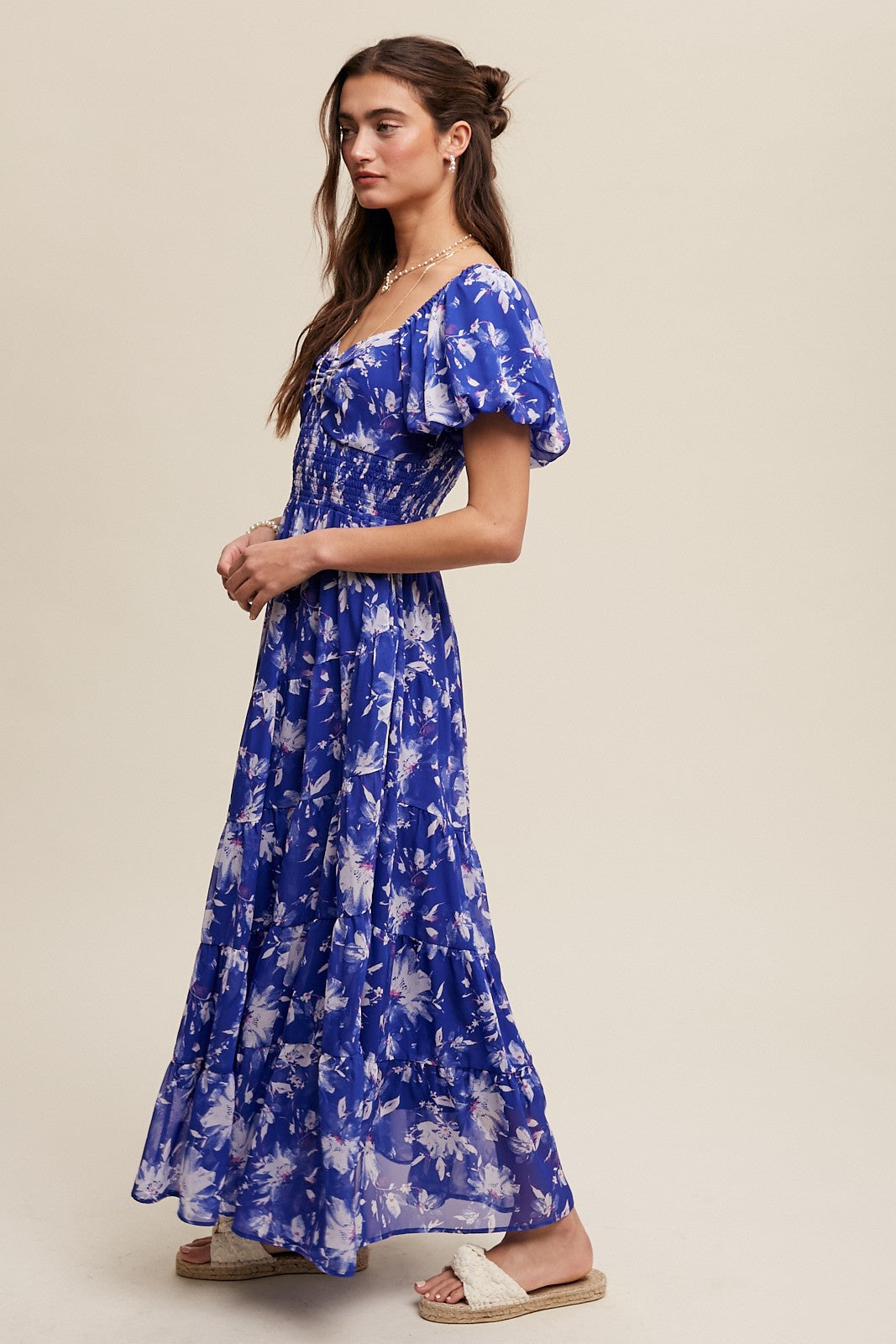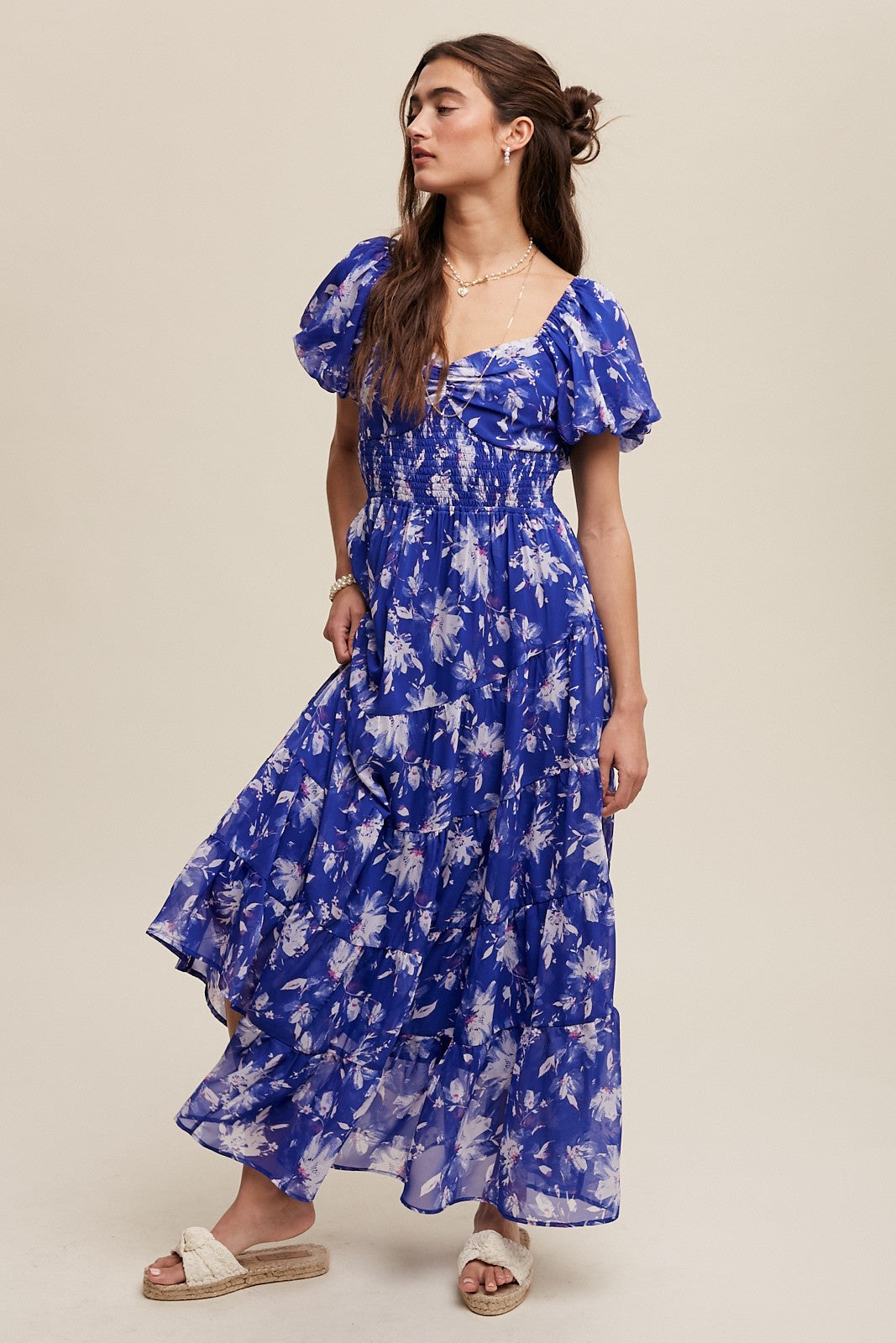 This women’s maxi dress features a floor – length silhouette with a fitted bodice and a flared, tiered skirt. Crafted from a lightweight, sheer fabric, it has a vibrant blue base with a white floral print and pinkish accents. The square neckline with a ruffled bust detail, short puffed sleeves, and smocked waist add to its feminine and bohemian – romantic look.