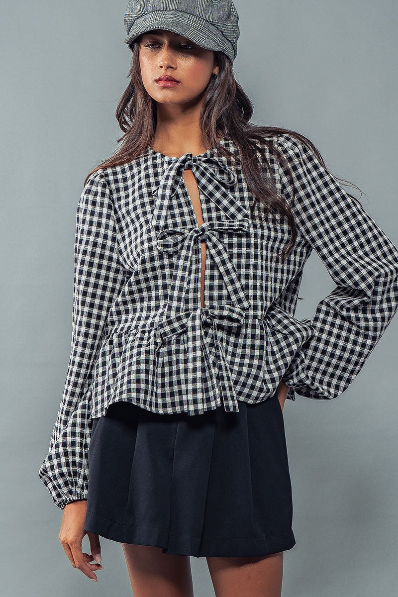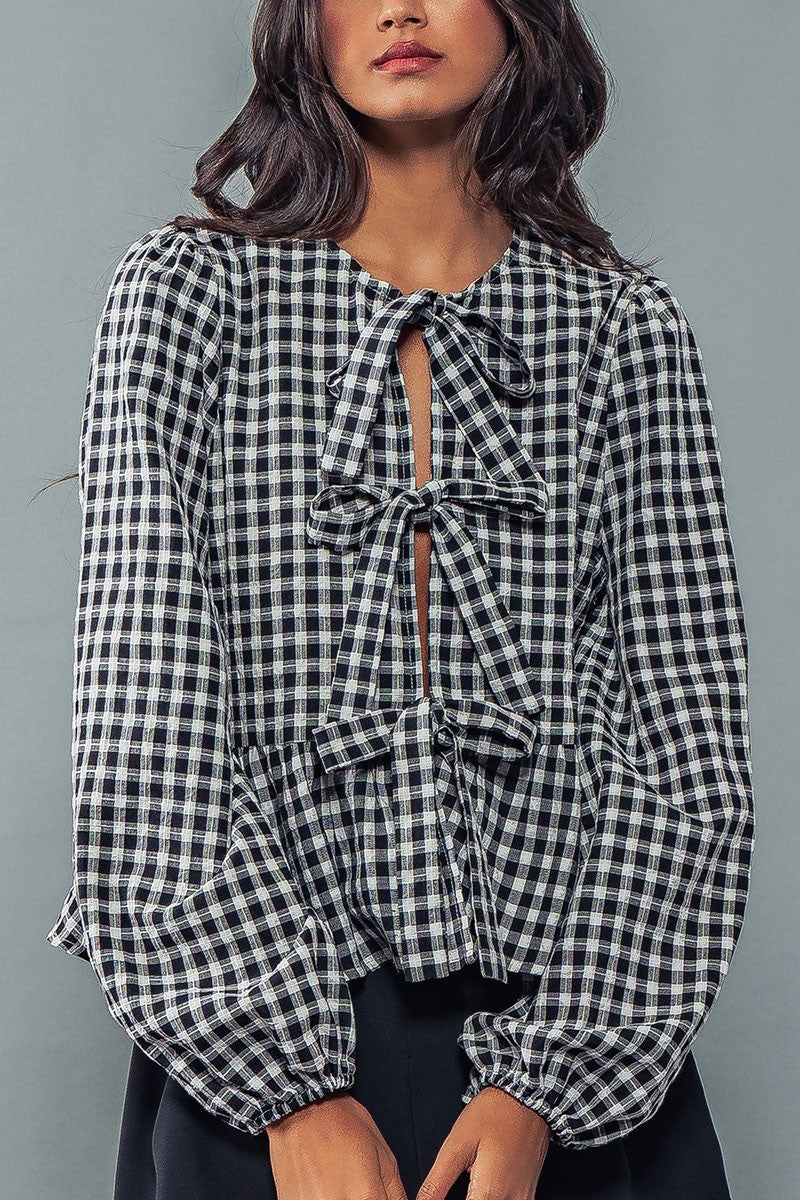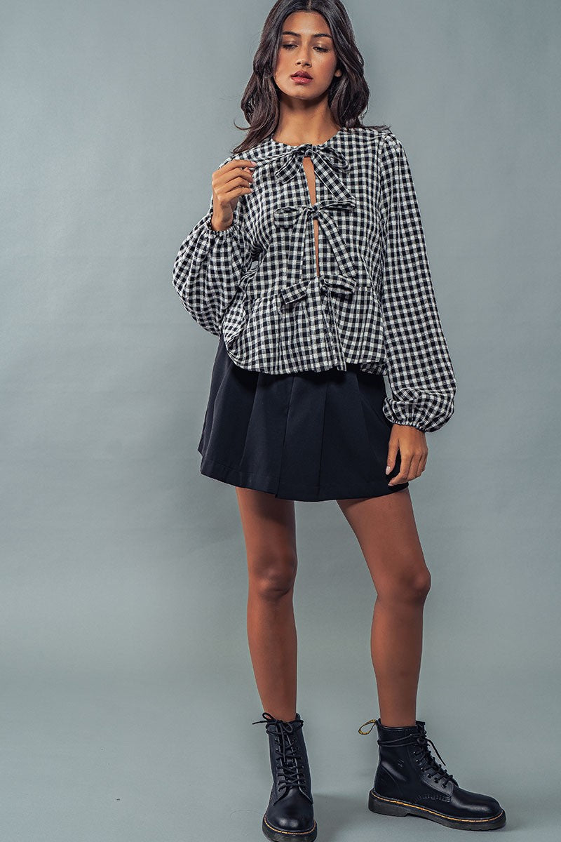 This women’s blouse features a classic gingham check pattern in black and white with a subtle gray or cream hue. It has multiple tied bows on the front, a round neckline with an additional bow, and long sleeves with elasticized cuffs. The cropped, peplum-style hem gives it a feminine and figure – flattering silhouette.