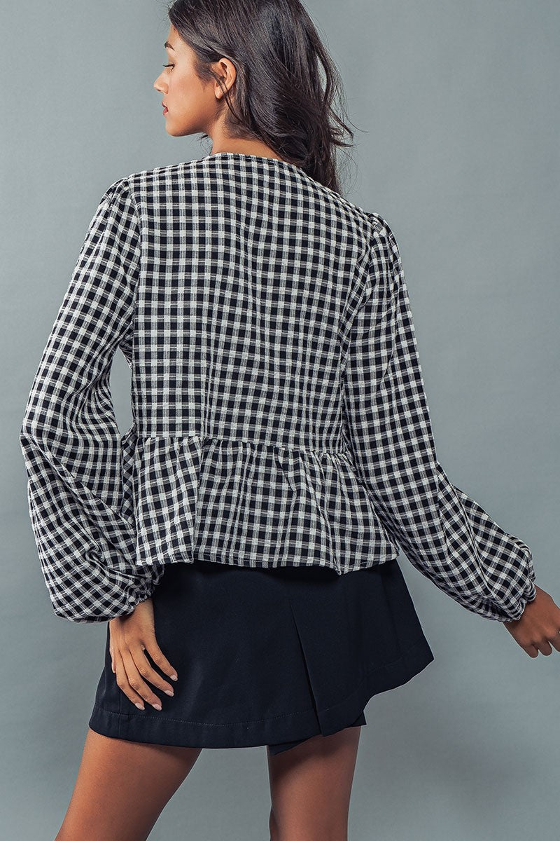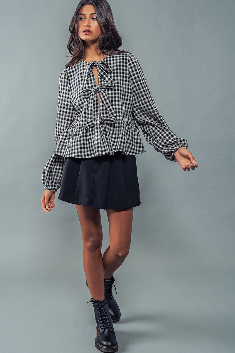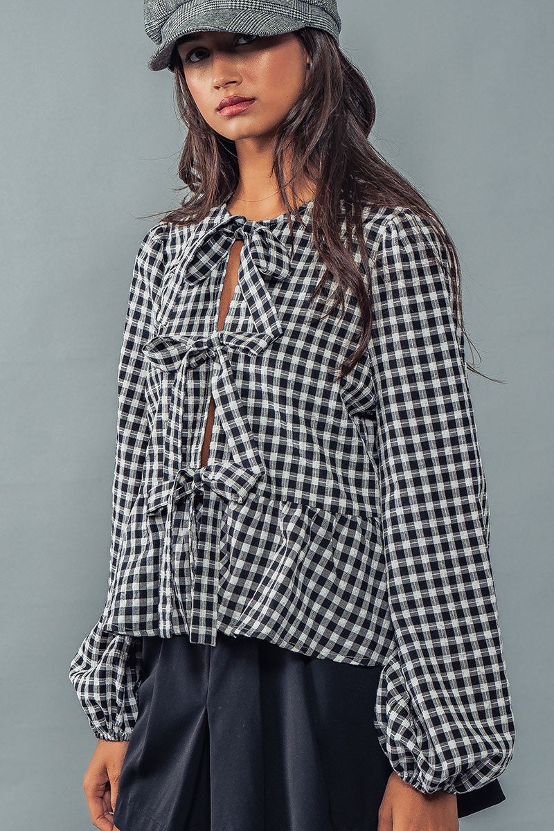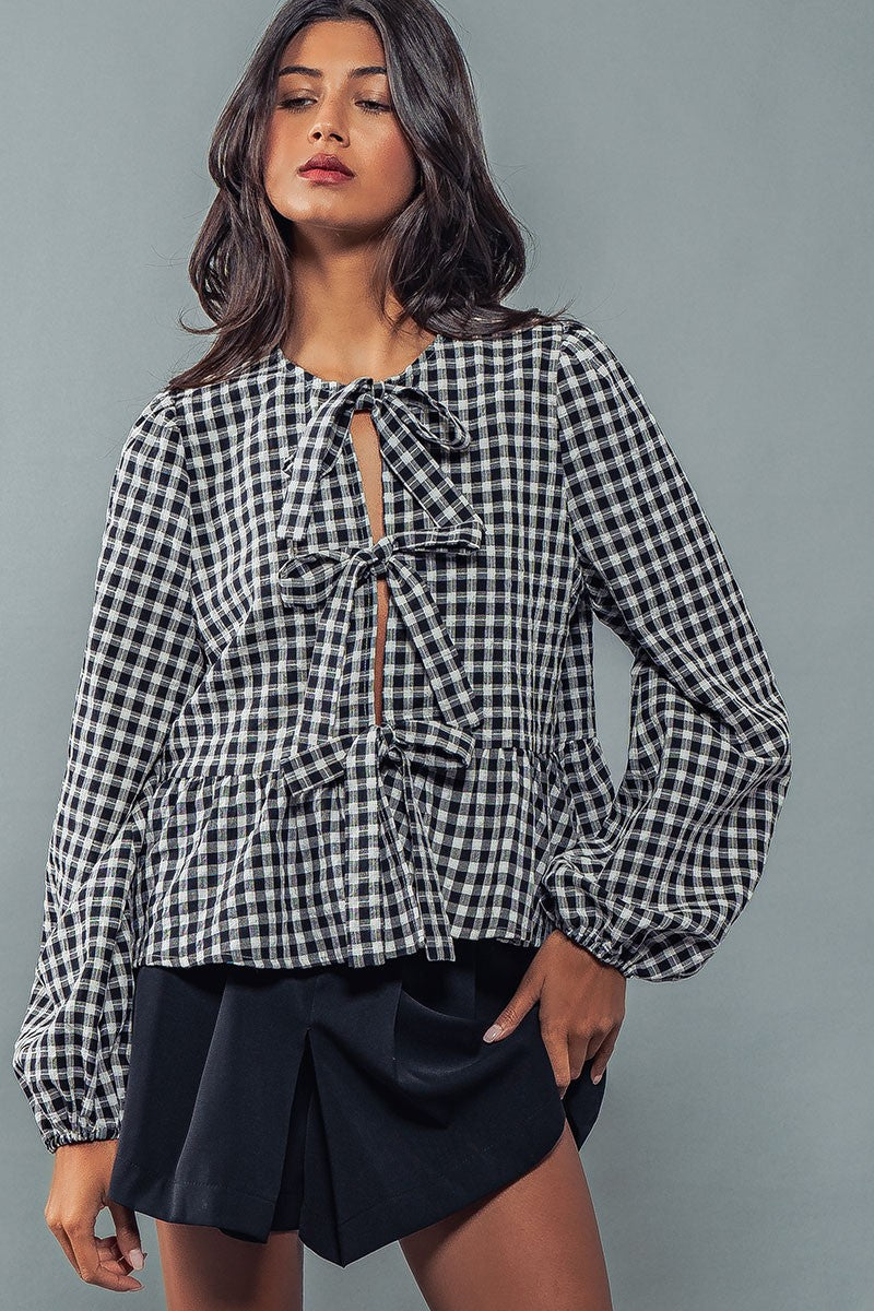 This women’s blouse features a classic gingham check pattern in black and white with a subtle gray or cream hue. It has multiple tied bows on the front, a round neckline with an additional bow, and long sleeves with elasticized cuffs. The cropped, peplum-style hem gives it a feminine and figure – flattering silhouette.