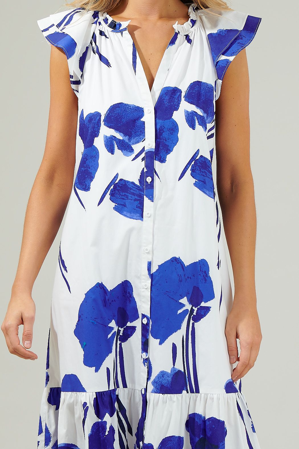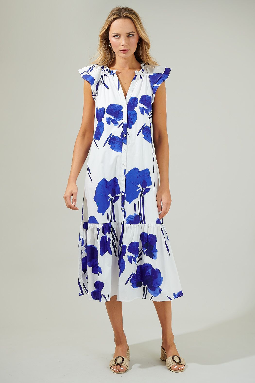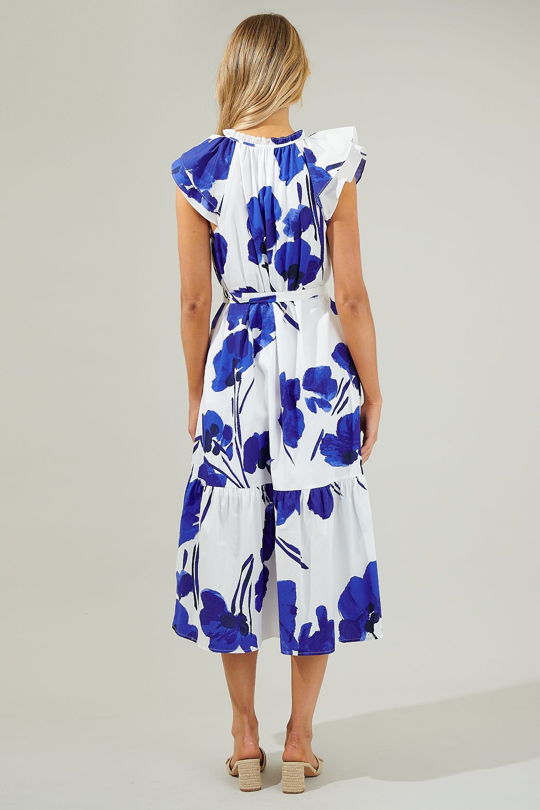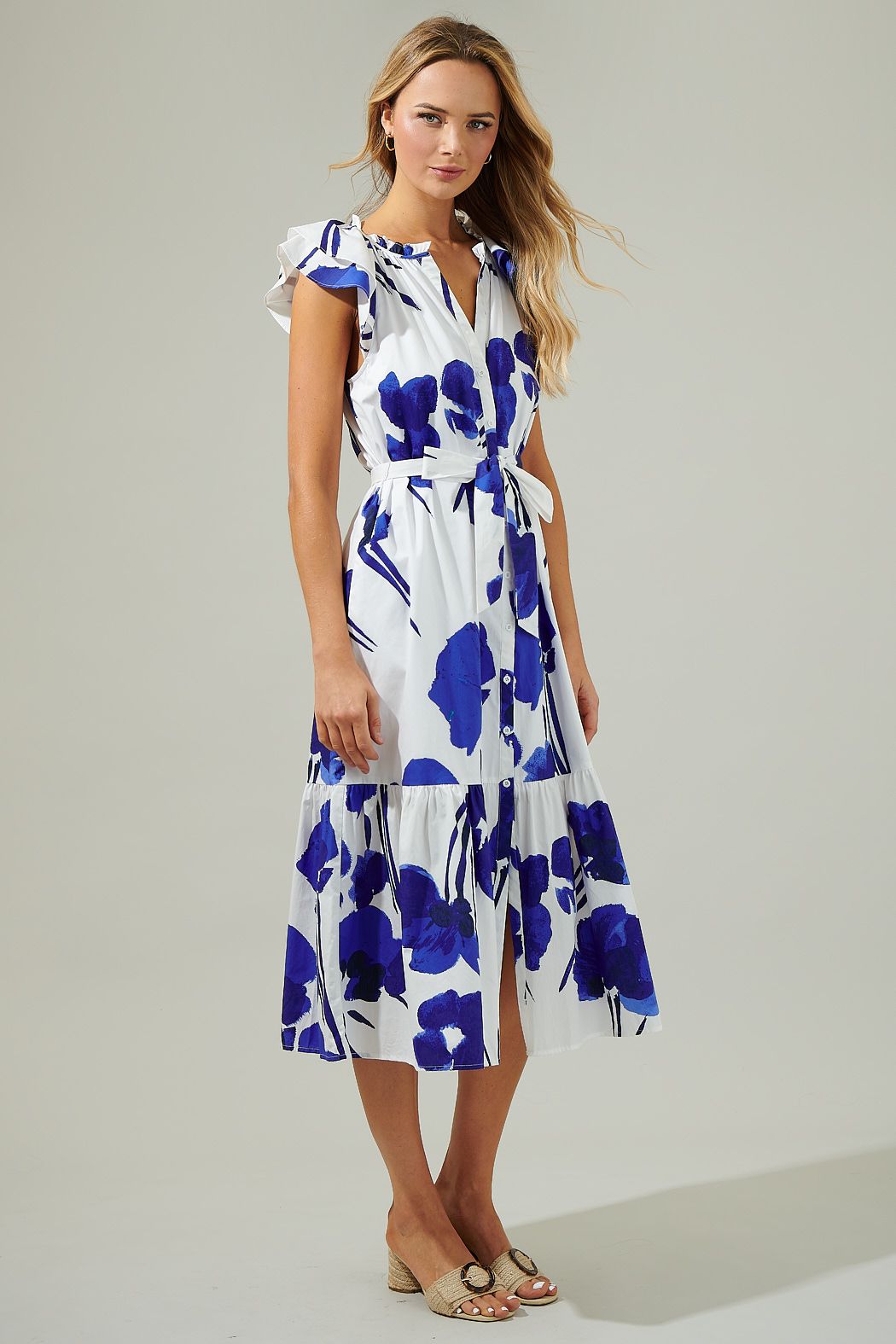 This midi dress is a perfect blend of style and comfort for warm weather. It features a white base with beautiful blue brushstroke floral prints. The ruffled V – neck, fluttery cap sleeves, and tiered skirt add a feminine touch, while the self – tie belt cinches the waist for a defined silhouette.