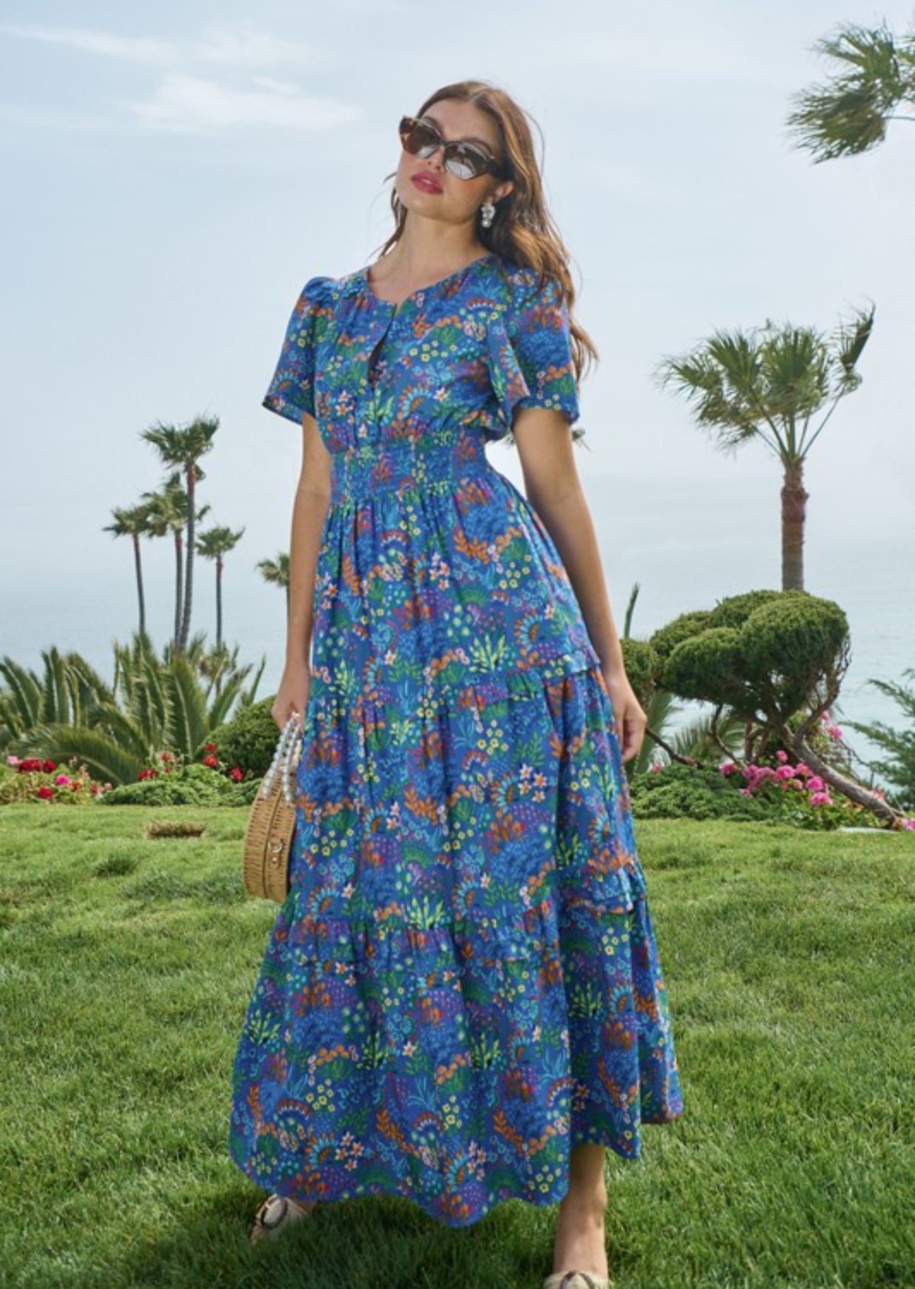 This women’s maxi dress is a perfect blend of style and comfort. It features an all – over vibrant floral print on a deep blue background, with short puffed sleeves and a V – neckline. The smocked waist adds shape, and the tiered ruffled skirt gives it a flowy, romantic look, making it ideal for warm – weather outings.
