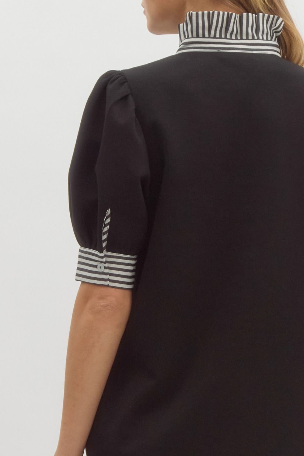 This women’s mini dress features a shift silhouette with short puffed sleeves and a stand – up collar. It has a solid – colored main body in either navy or black, complemented by contrasting white and dark horizontal striped trim on the collar and cuffs. The dress also includes functional front pockets and a single – button placket on the navy version, offering a casual yet stylish look for daytime wear.