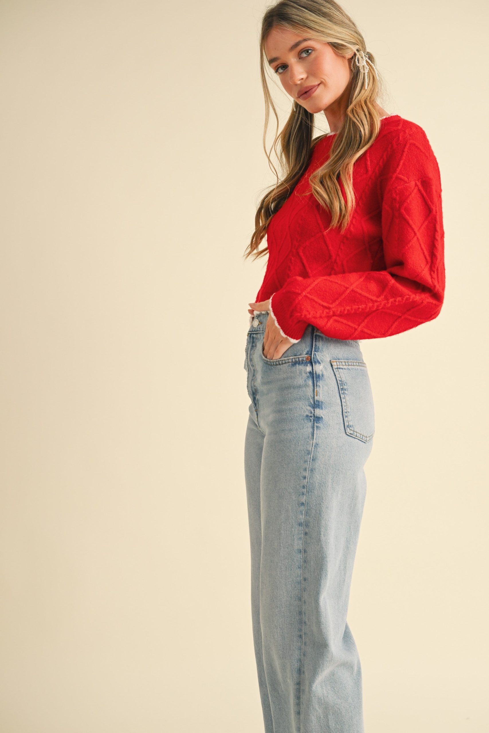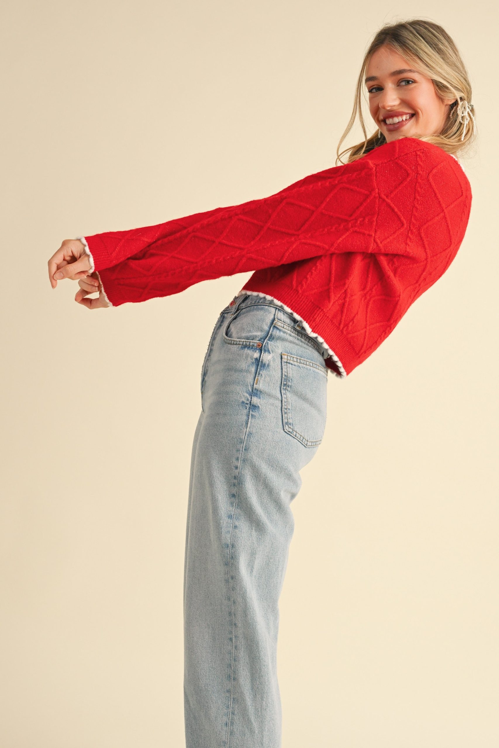 Indulge in the charm of this women’s cropped cable – knit sweater. It comes in a striking red color with a festive feel, making it perfect for various occasions. The thick, soft knit body is adorned with a white, fluffy contrast trim on the neckline, cuffs, and hem, adding a decorative touch and extra insulation.