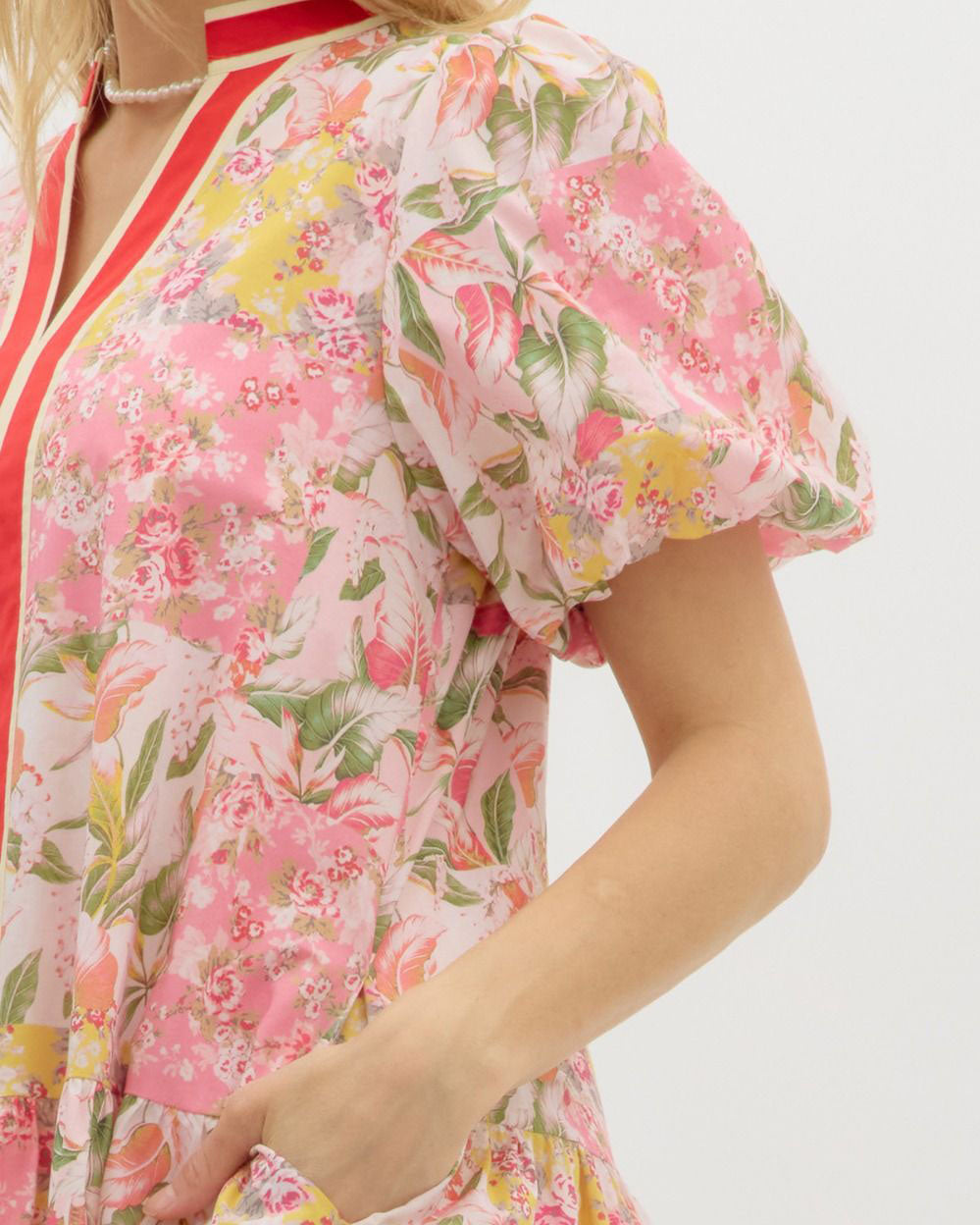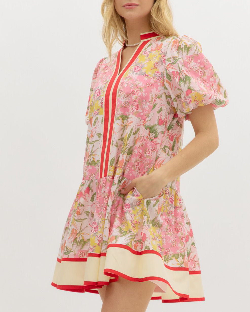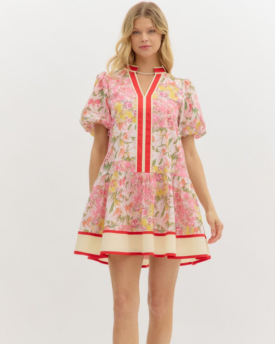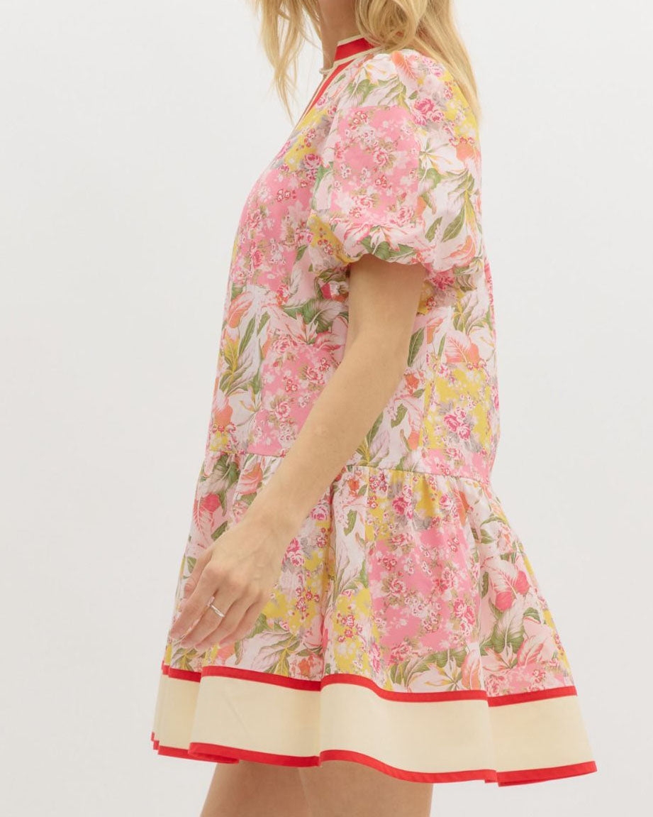 This women’s vintage-inspired mini dress is a charming addition to any wardrobe. It features a vibrant floral print on a lightweight, breathable fabric that drapes softly. The structured red and cream trim, along with the short puffed sleeves, adds a touch of romance and vintage appeal, while the A-line skirt enhances movement and creates a playful silhouette.