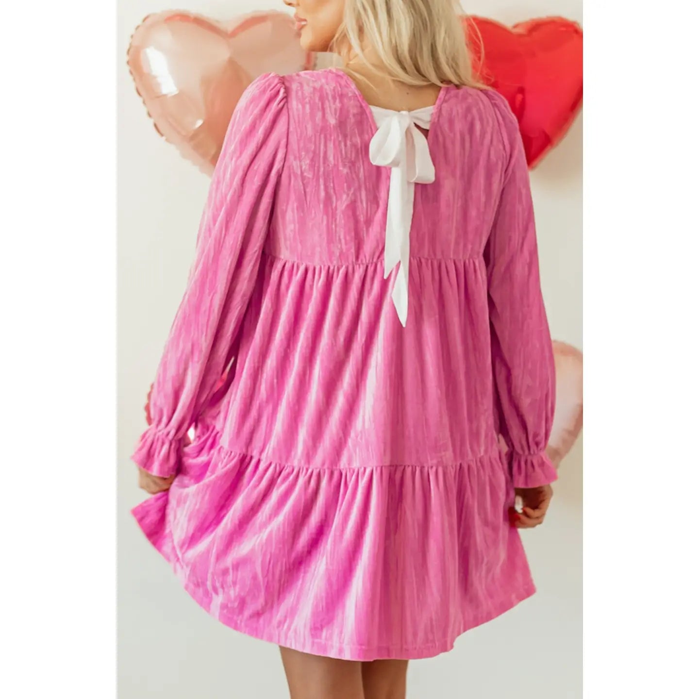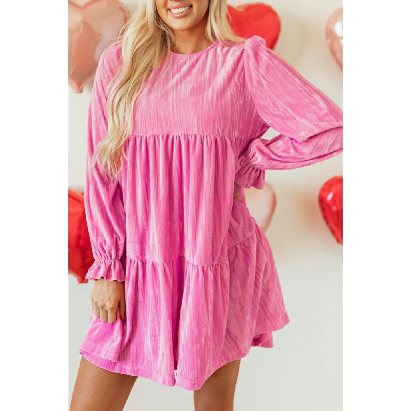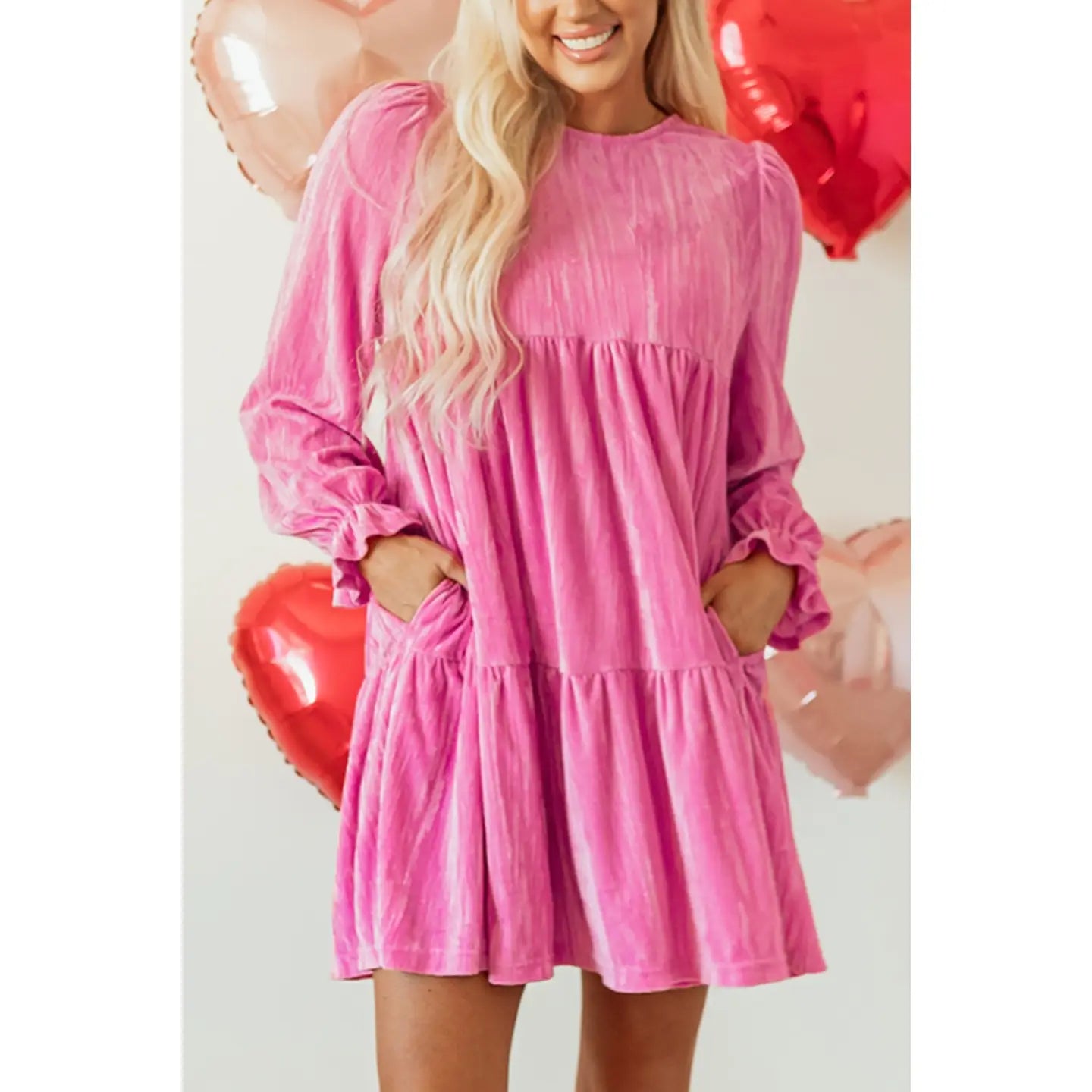 This women’s mini dress is a delightful blend of style and comfort. Made from a soft, textured fabric with a velvety look, it features a vivid pink color and a playful design. The tiered skirt and puffed sleeves add a feminine touch, while the side pockets enhance its practicality.