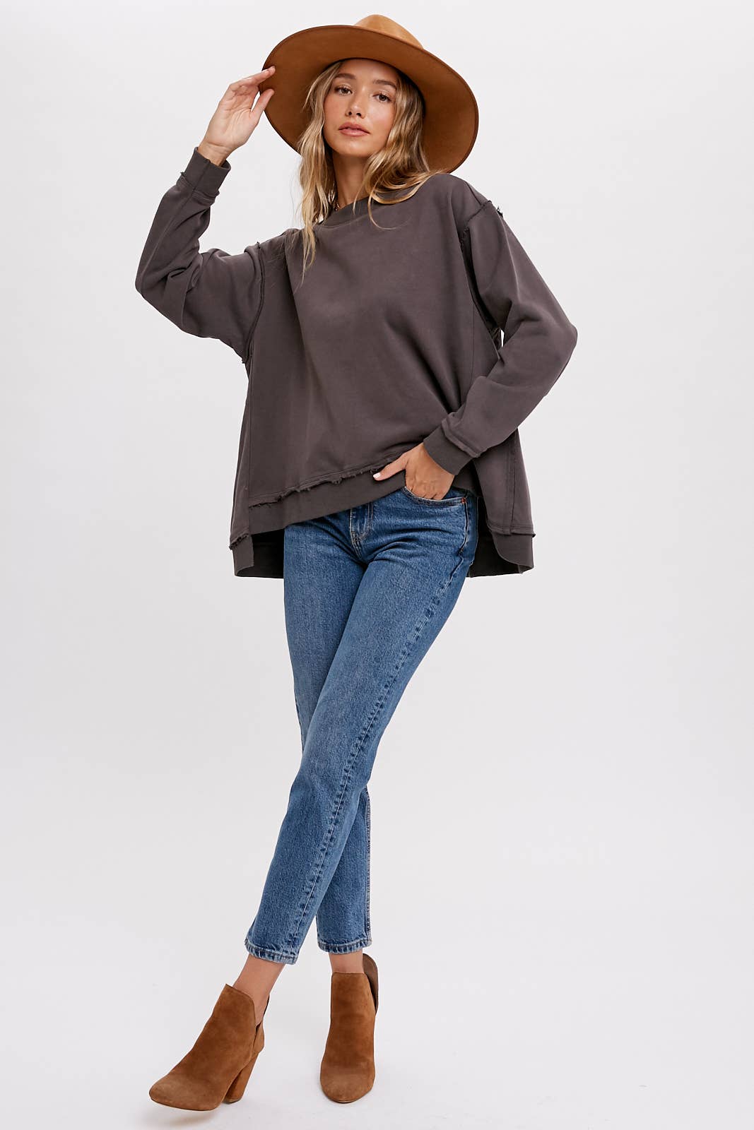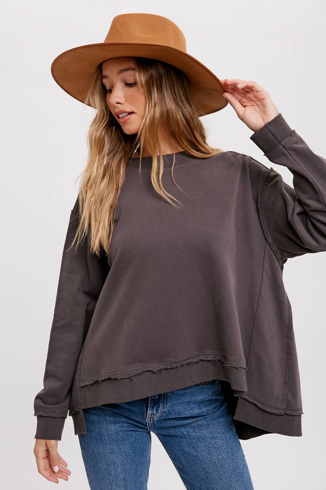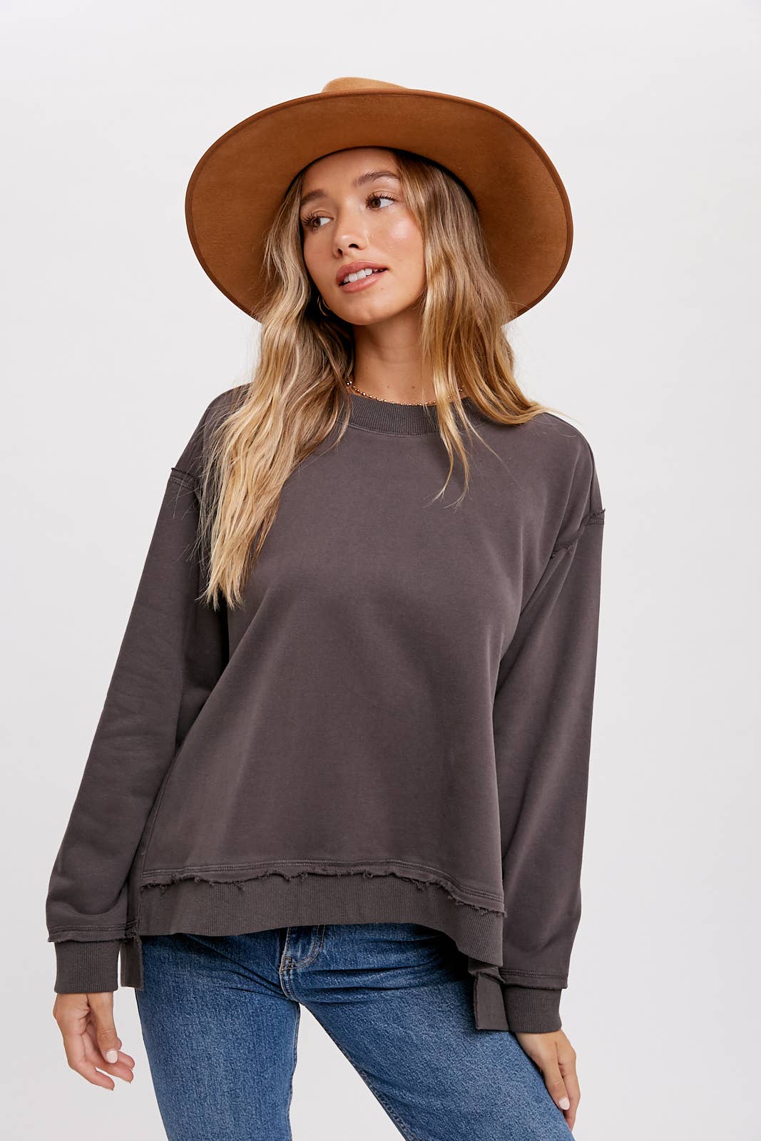 This is an oversized crew – neck sweatshirt, perfect for casual, everyday wear. Crafted from a soft cotton – blend fabric with a fleece interior, it offers both warmth and comfort. The frayed hem and high – low design add a trendy, vintage – inspired touch to the classic sweatshirt style.