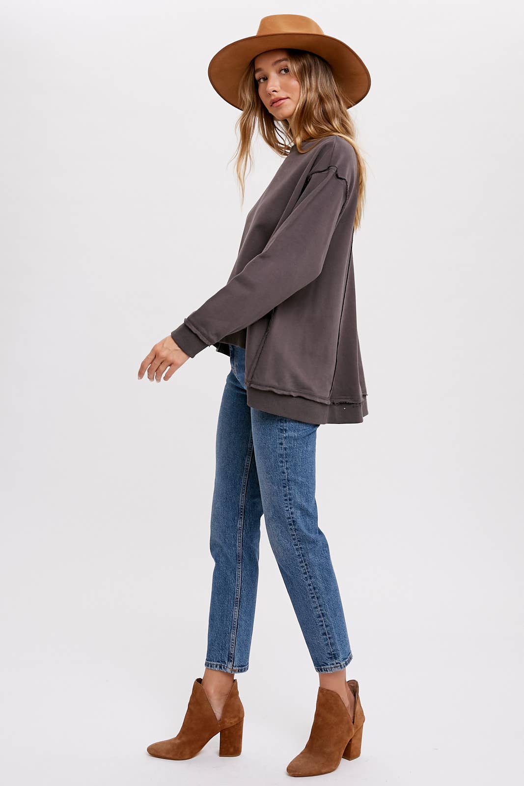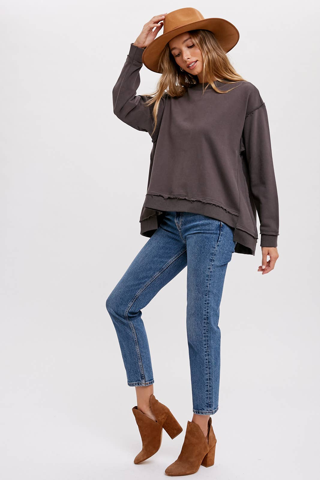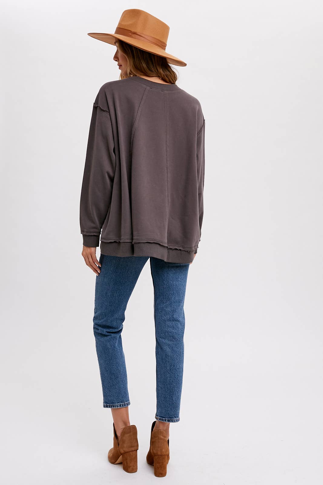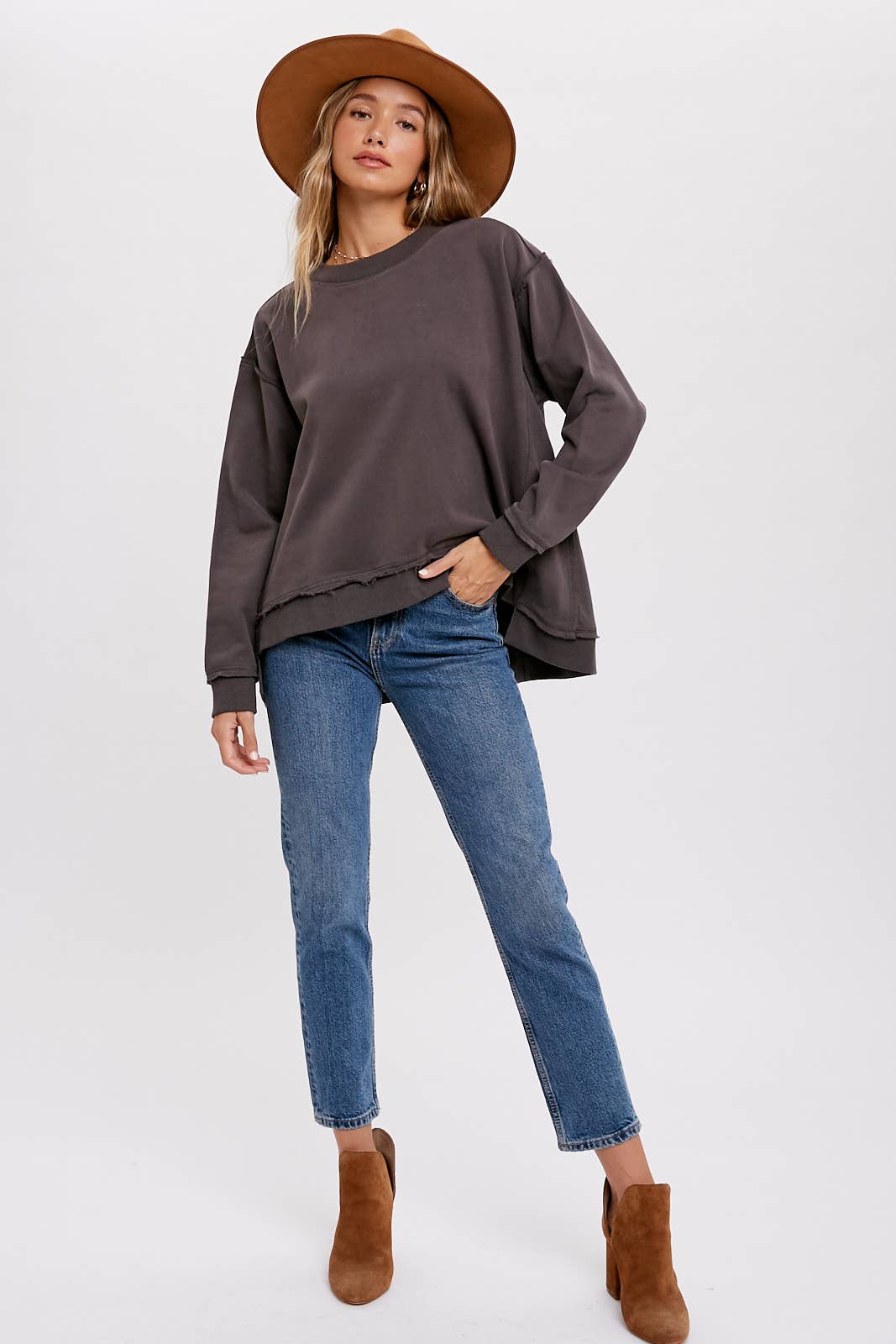 This is an oversized crew – neck sweatshirt, perfect for casual, everyday wear. Crafted from a soft cotton – blend fabric with a fleece interior, it offers both warmth and comfort. The frayed hem and high – low design add a trendy, vintage – inspired touch to the classic sweatshirt style.