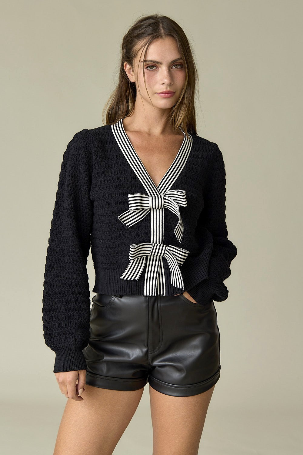 This women’s cropped knit top is a stylish and trendy piece. It features a solid black textured knit main body with vertical black – and – white striped bows and neckline trim. The V – neck and cropped hem add a fashionable touch, making it suitable for both layering and standalone wear.