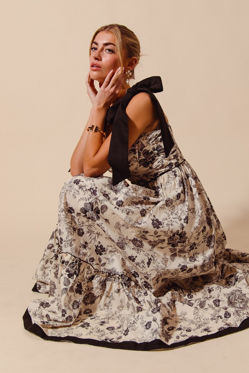 This women’s maxi dress offers a romantic, vintage-inspired silhouette. It has a cream/off – white base with a dark floral pattern, and is enhanced by black accents like the shoulder bows and trim. The lightweight cotton – blend fabric makes it both breathable and suitable for formal or semi – formal events.